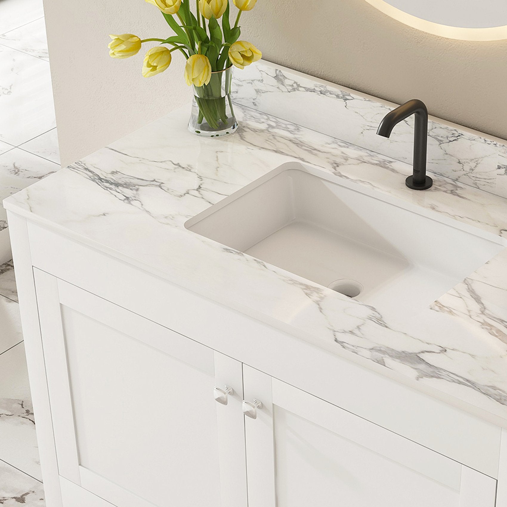 - Top material: Sintered stone in Carrara white — durable, stain- and scratch-resistant for long-lasting beauty
