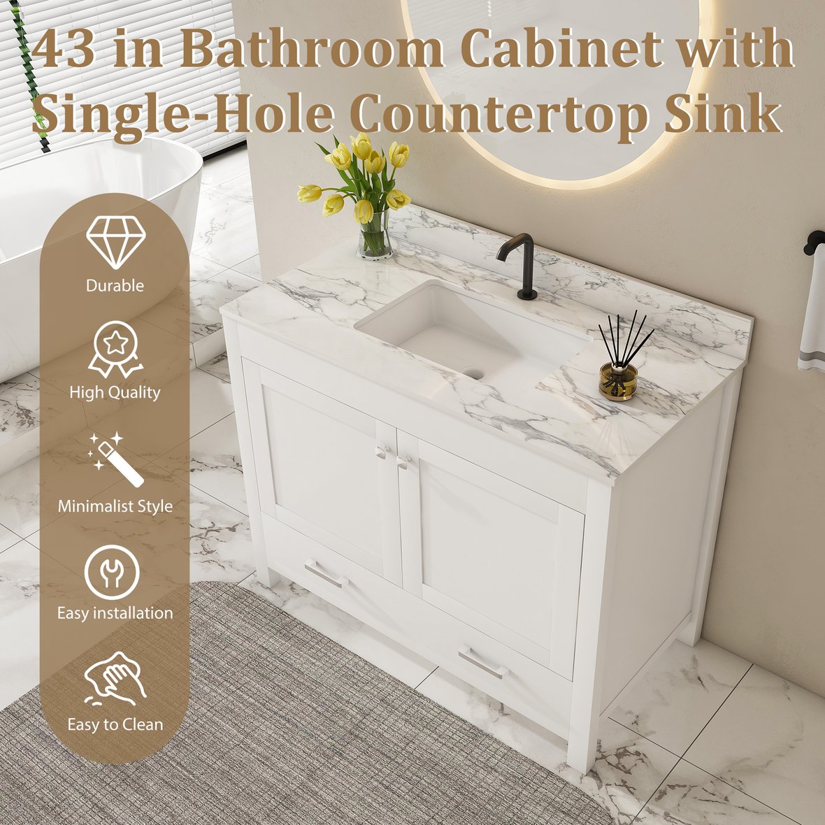 - Fashionable and practical: The bathroom vanity can be paired with a 43*22-inch ceramic sink. The pre-drilled holes of the ceramic sink simplify the installation of the faucet, enhancing the usability of the vanity cabinet without affecting the style.