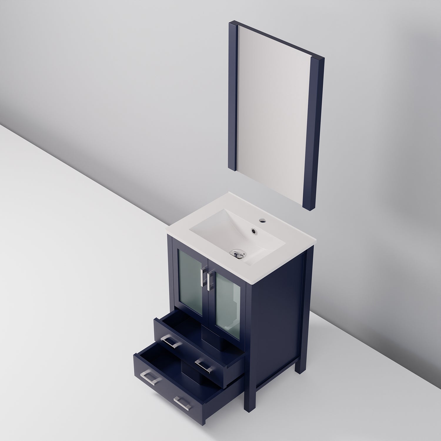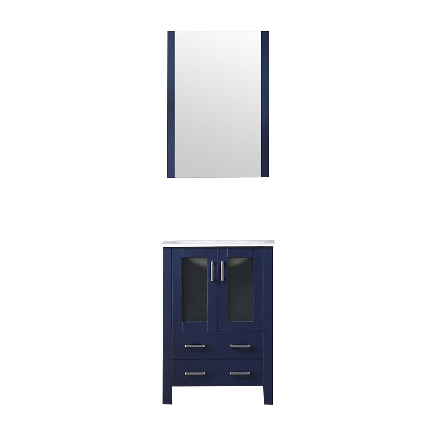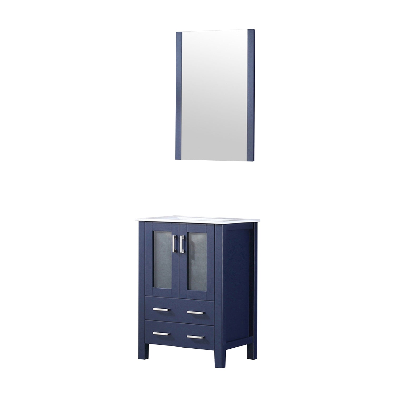 Refresh your bathroom with this compact, modern navy blue vanity set that combines durable materials, thoughtful storage, and a clean ceramic top for everyday use. Ideal for small bathrooms, powder rooms, or guest baths, it balances style and functionality with soft-close drawers and an included mirror to complete the look.