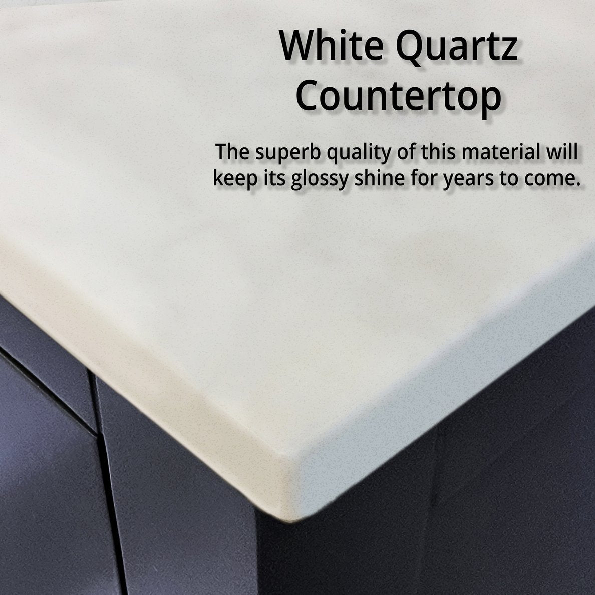 - Top: Left-offset white quartz countertop with a scratch- and stain-resistant surface for long-lasting durability and easy cleaning.