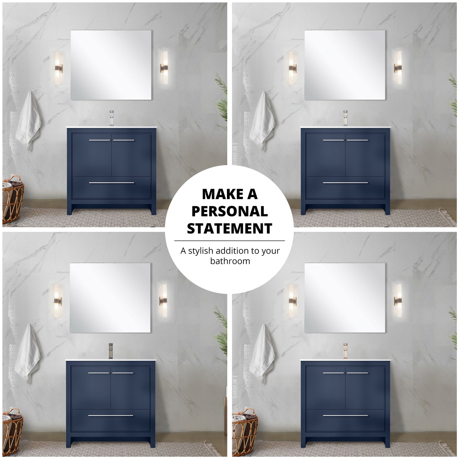 Elevate your bathroom with this stylish navy blue vanity that blends contemporary design with durable materials and thoughtful storage. The cultured marble top provides a sleek, easy-to-clean surface, while the included brushed nickel faucet and soft-close hardware add a refined, functional touch. Ideal for mid-size bathrooms, this vanity combines form and function to create a polished focal point.