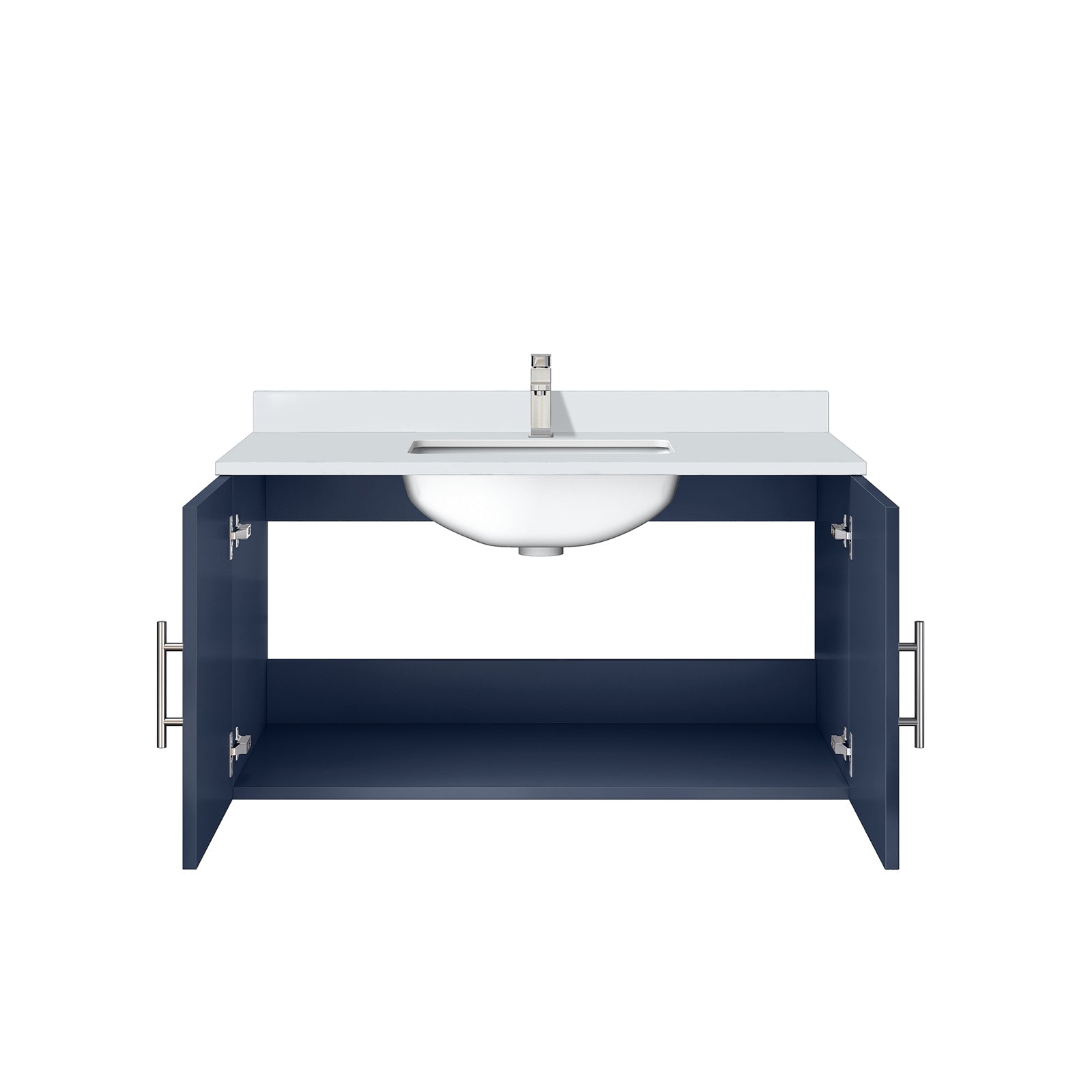 - Color & finish: Deep navy blue cabinet with a polished white quartz countertop for a clean, contemporary contrast.