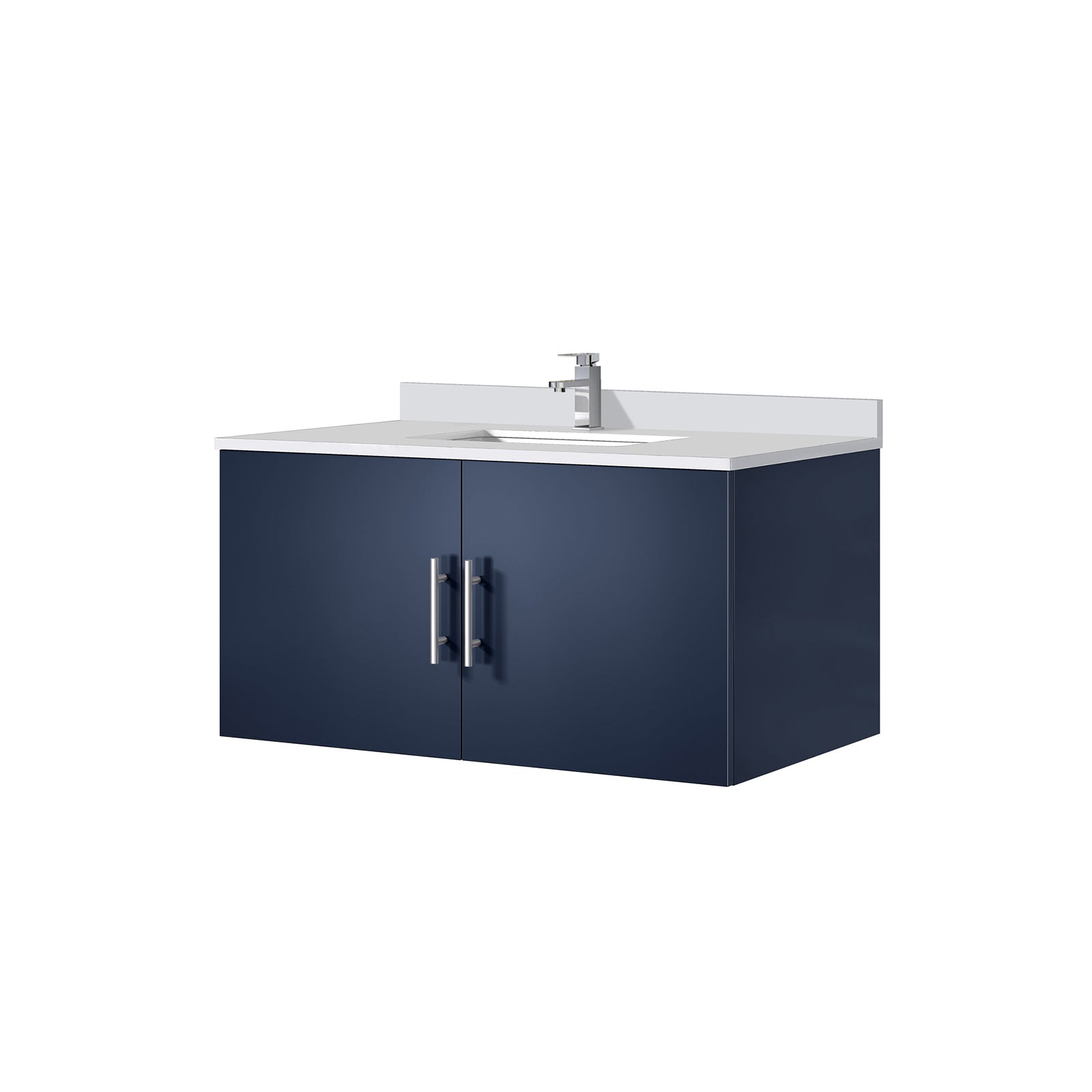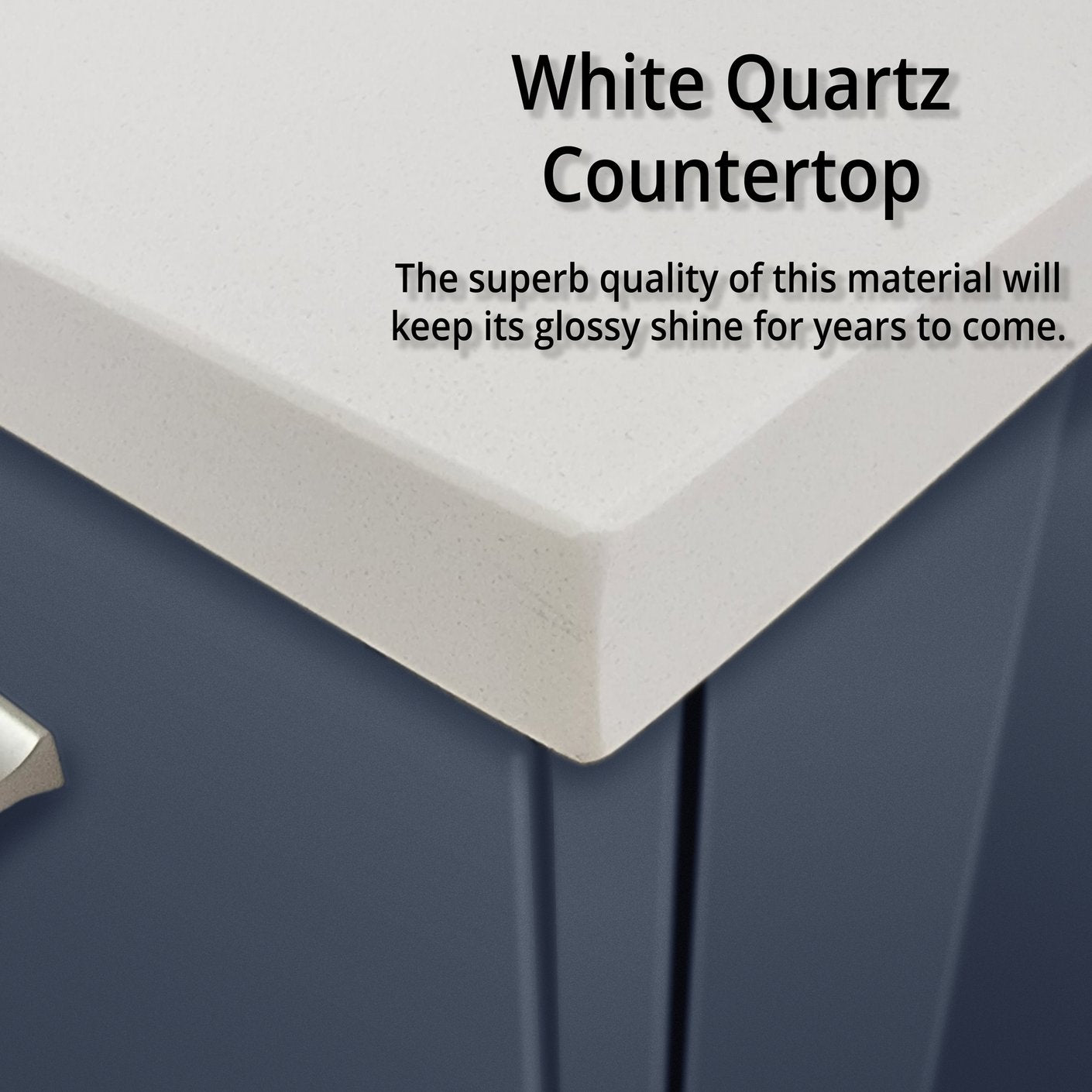 Elevate your bathroom with this elegant navy blue vanity that blends classic styling with modern durability. The compact 36 in. width fits smaller bathrooms or powder rooms while offering generous storage and a resilient white quartz countertop. Included chrome single-hole faucet and soft-close hardware complete the look, delivering both convenience and a refined finish.