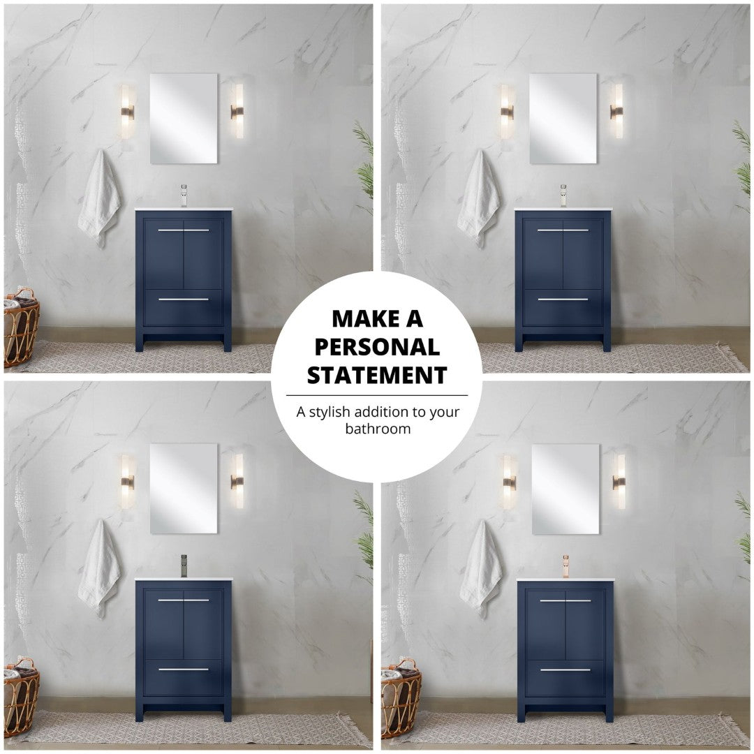 Update your bathroom with this elegant navy blue vanity that combines classic style and modern functionality. Built with durable wood construction, a white quartz top, and a brushed nickel faucet, it offers a refined focal point and practical storage for smaller bathrooms, powder rooms, or guest baths.