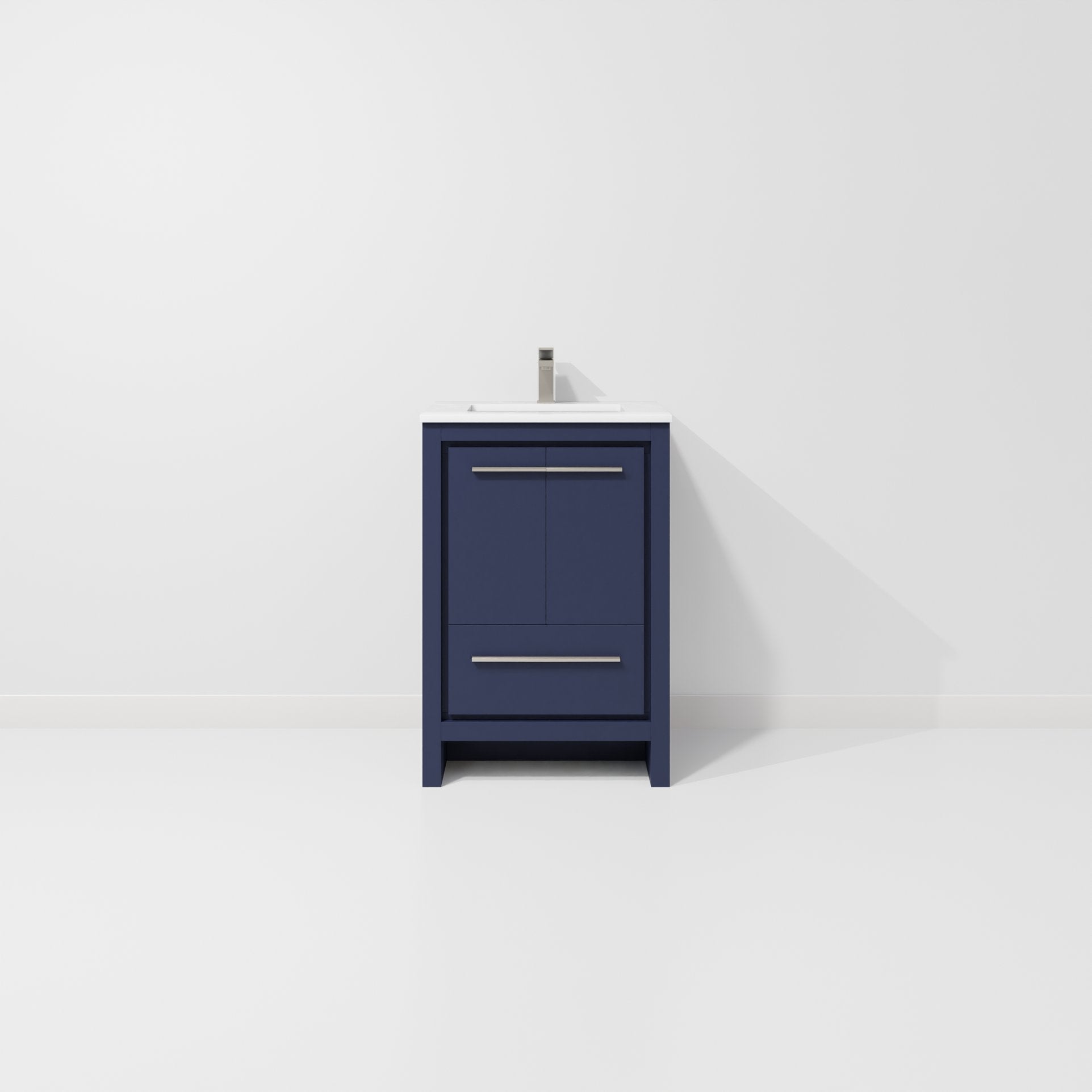 Update your bathroom with a stylish navy blue vanity that combines modern elegance with functional storage and durable surfaces. This compact, well-designed unit includes a white quartz countertop and a gun metal faucet, offering a coordinated, high-end look that fits small to medium bathrooms or powder rooms.