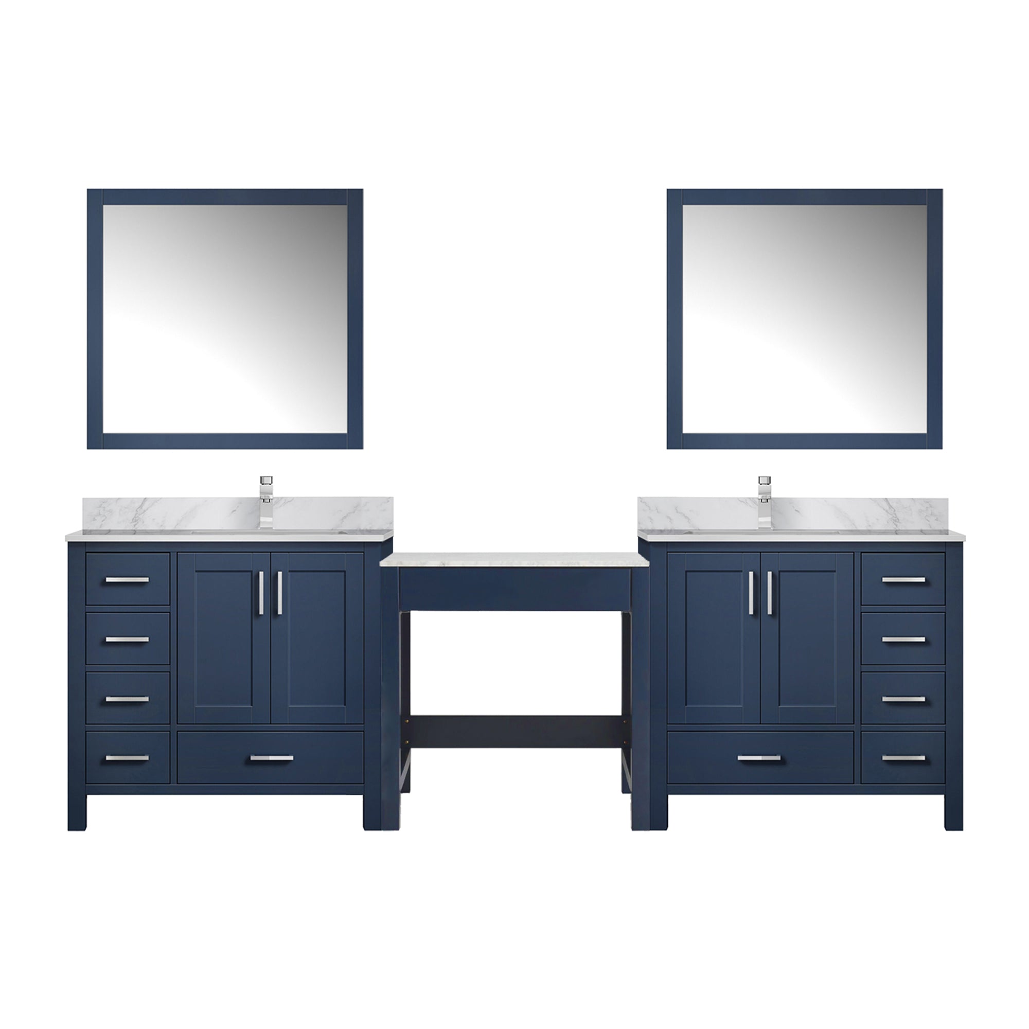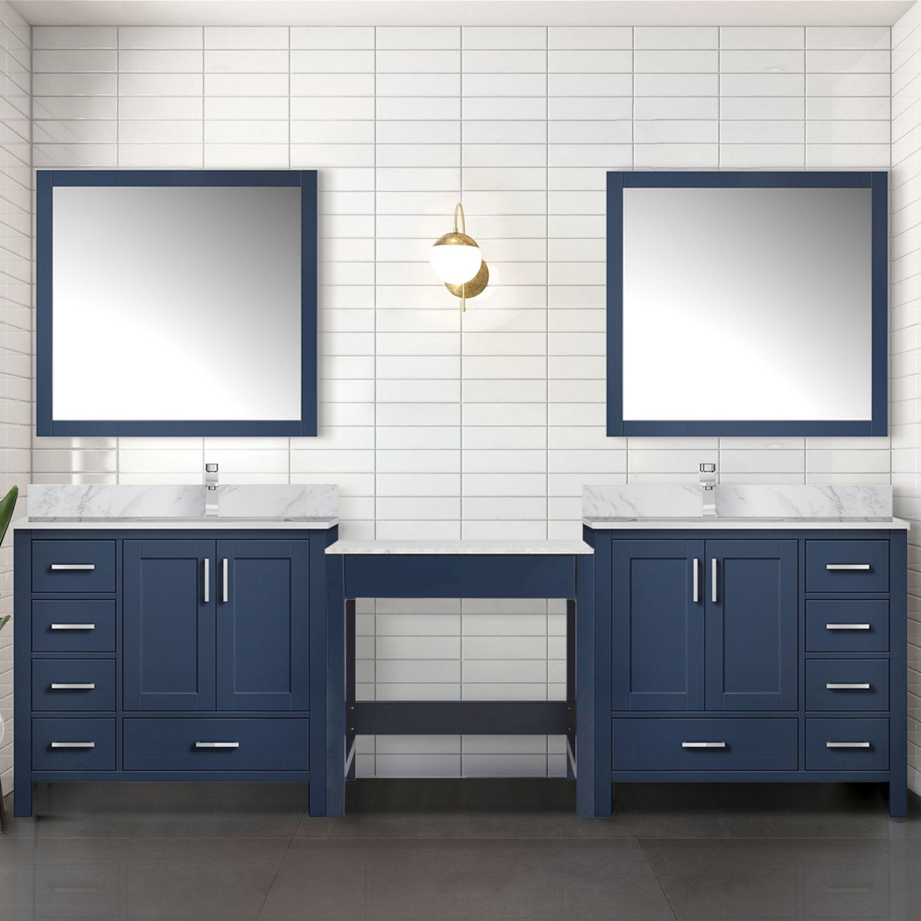 Elevate your bathroom with this elegant navy blue double vanity ensemble, thoughtfully designed for both style and functionality. The set pairs a spacious wood vanity with a classic Carrara marble top, chrome Monte faucets, and two coordinating mirrors—offering a cohesive, high-end look that fits modern and transitional spaces alike. Durable finishes and practical features ensure long-lasting performance for daily use.
