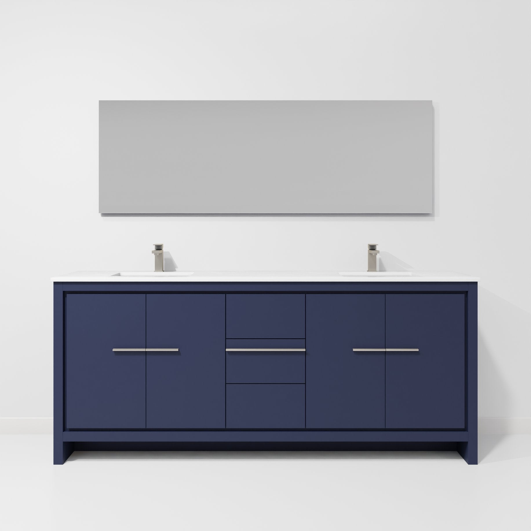 Make a bold statement in your bathroom with this navy blue double vanity ensemble that blends durable materials, thoughtful storage, and coordinated hardware for a polished, functional focal point. Designed for busy households and style-forward renovations, it pairs a scratch- and stain-resistant cultured marble countertop with a spacious cabinet layout, a coordinated gun metal faucet set, and a large matching mirror to simplify installation and elevate daily routines.