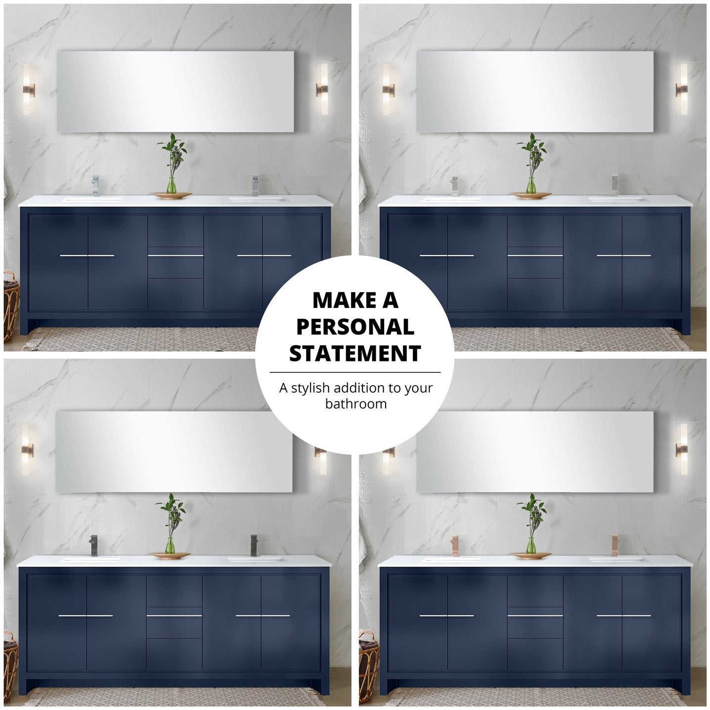 Give your bathroom a timeless, high-end update with this navy blue double vanity, designed for durability, storage, and easy daily use. The cultured marble top and included chrome faucet set deliver a polished look, while soft-close doors and drawers keep the space quiet and refined — ideal for busy households or guest baths.