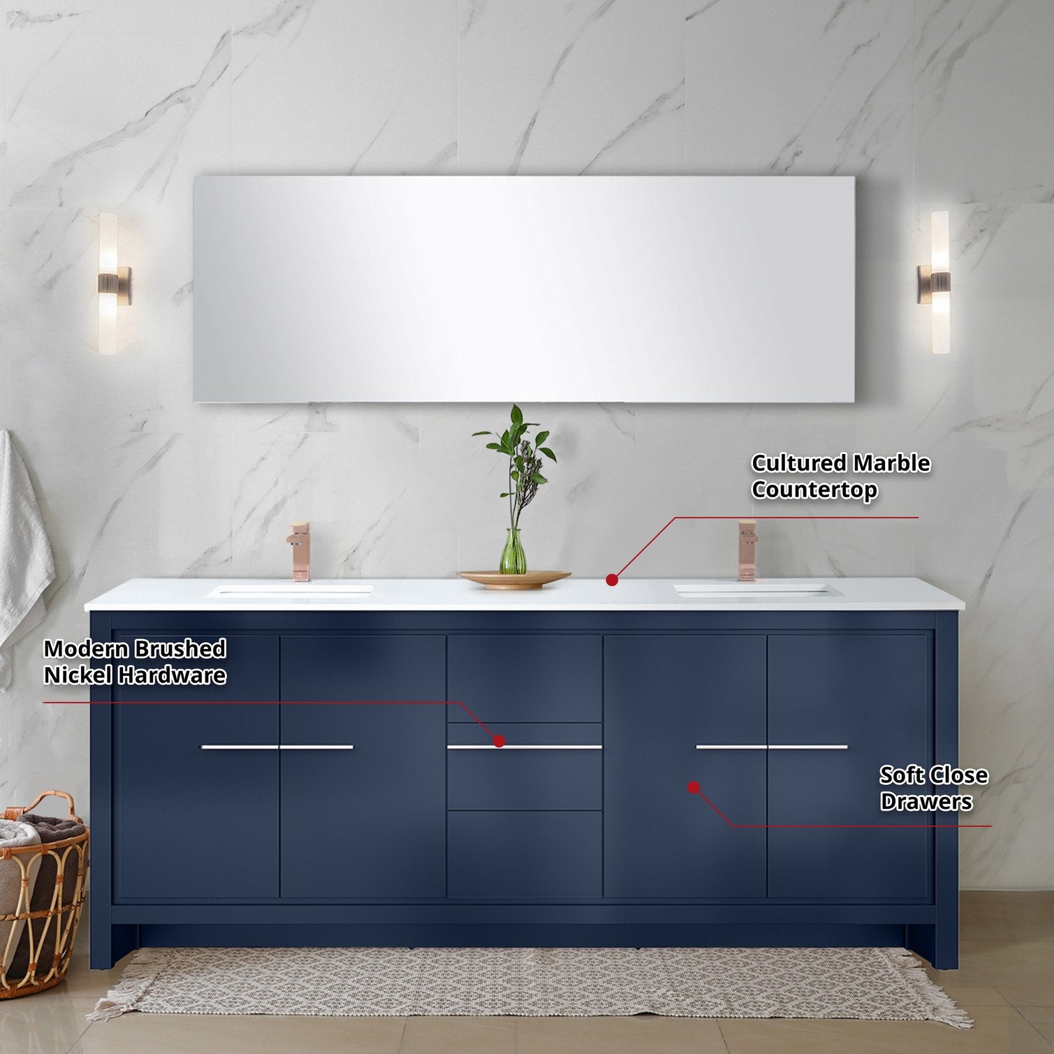 Upgrade your bathroom with a statement-making navy blue double vanity that blends modern elegance with practical durability. This complete set includes a cultured marble countertop, rose gold faucet, and a wide mirror—designed to provide generous workspace, ample storage, and a cohesive, high-end look that complements contemporary and transitional interiors.