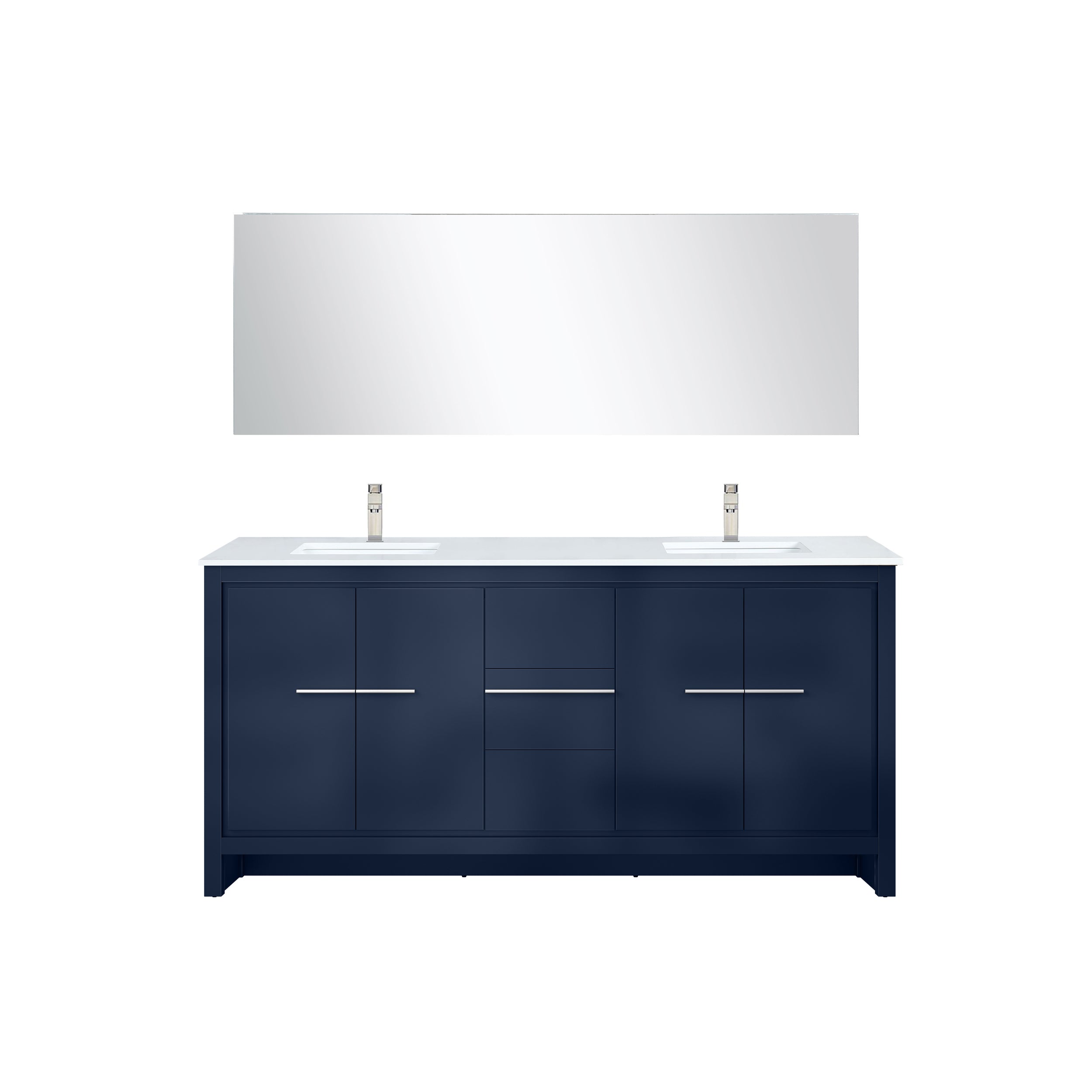 Elevate your bathroom with this sophisticated navy blue double vanity ensemble, designed for both style and long-lasting performance. The set pairs a roomy, solid wood vanity with a scratch- and stain-resistant white quartz countertop, a brushed nickel Labaro single-hole faucet set, and a large 70-inch mirror — all curated to create a cohesive, high-end look and simplify installation.