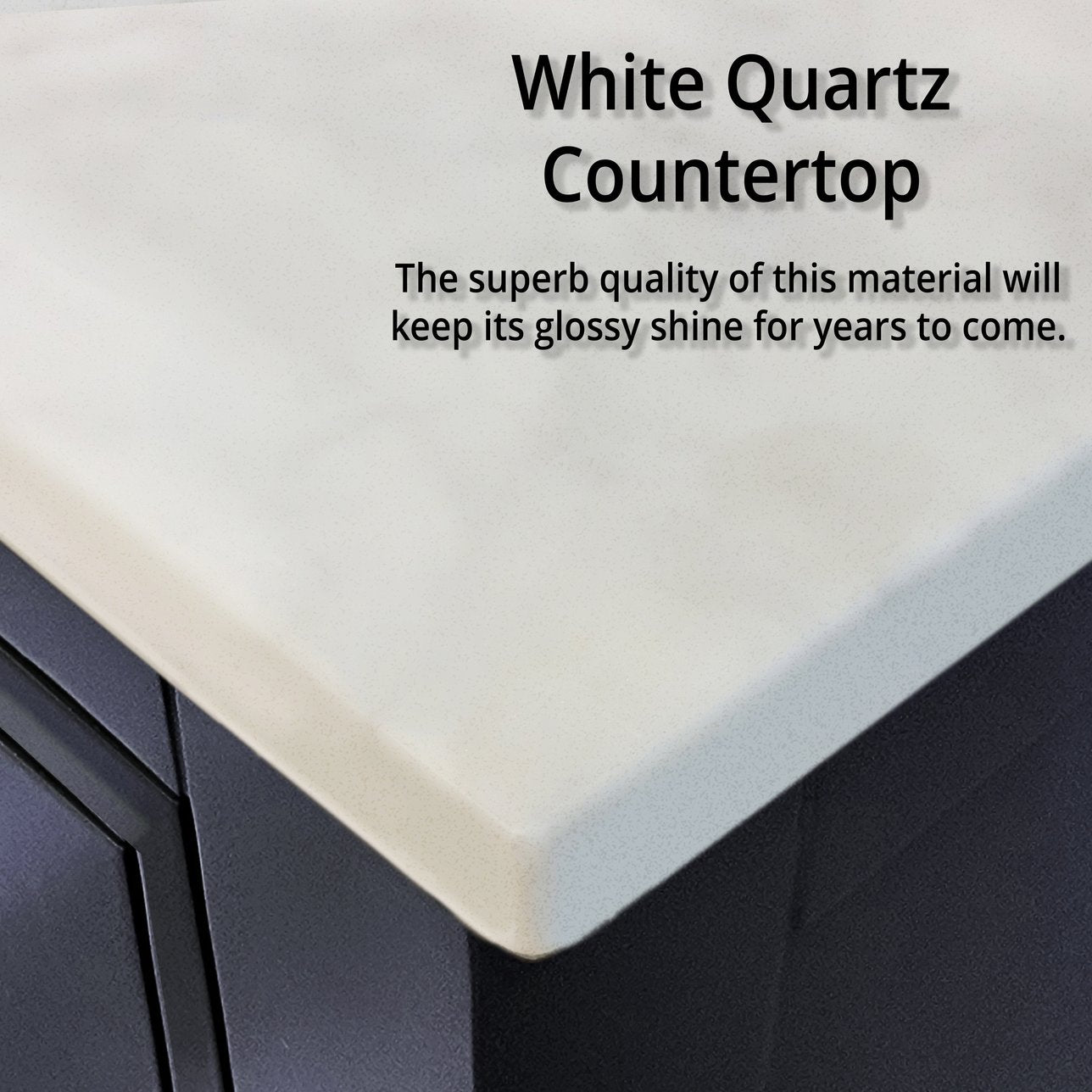 - Finish & Material: Elegant navy blue wood cabinet with a durable white quartz countertop that resists scratches and stains