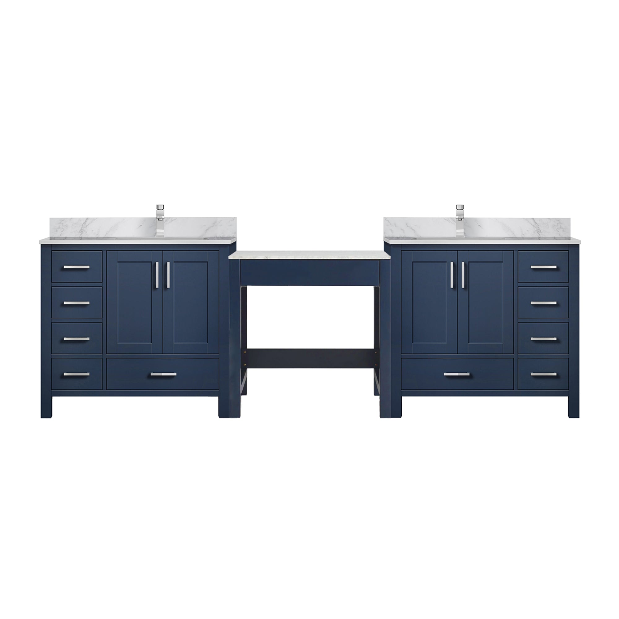 Elevate your bathroom with this elegant navy blue double vanity, designed for spacious functionality and refined aesthetics. The classic Carrara marble top pairs with a durable, scratch- and stain-resistant countertop finish, while soft-close drawers and included chrome faucets deliver a premium, worry-free experience for everyday use.