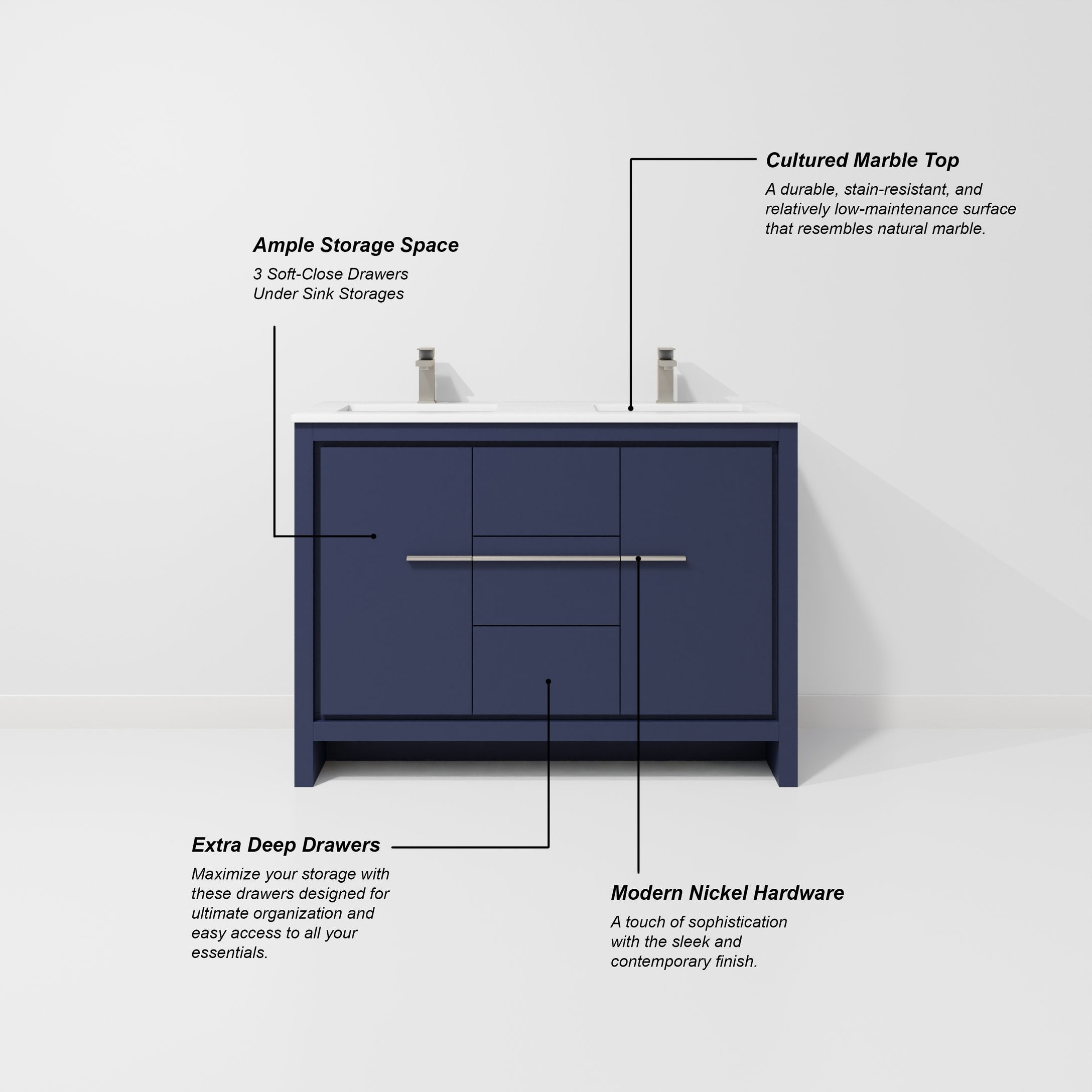 Elevate your bathroom with a refined navy blue double vanity that combines classic styling with durable, user-friendly features. This unit offers generous storage, a low-maintenance cultured marble countertop, and soft-close hardware for a quiet, premium experience—ideal for busy households seeking both form and function.