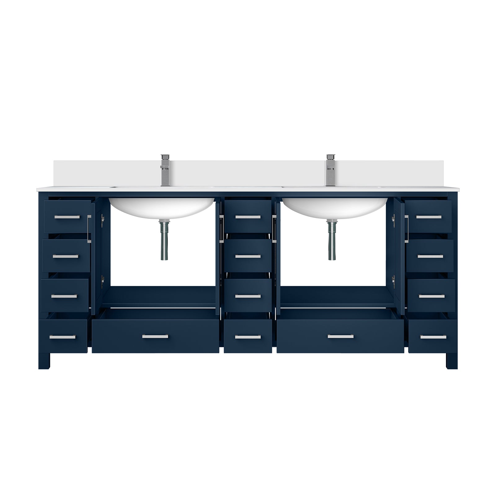 Upgrade your bathroom with this elegant navy blue double vanity, combining substantial storage, durable surfaces, and a complete faucet set for a ready-to-install centerpiece. Crafted from wood with a cultured marble top and soft-close hardware, it blends refined style with practical features to streamline daily routines and keep your space organized.