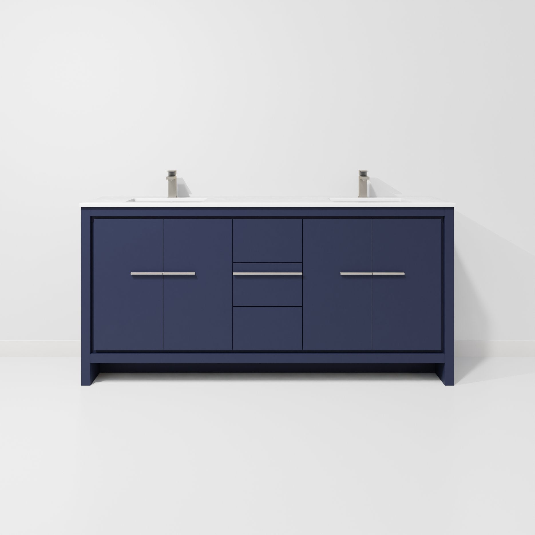 Elevate your bathroom with this elegant navy blue double vanity, designed to combine generous storage, durable surfaces, and a modern aesthetic. The cultured marble top offers a sleek, easy-to-clean workspace while the included gun metal faucet set adds a contemporary finishing touch. Built for functionality, this vanity balances ample organization with high-quality materials and thoughtful hardware for lasting performance.