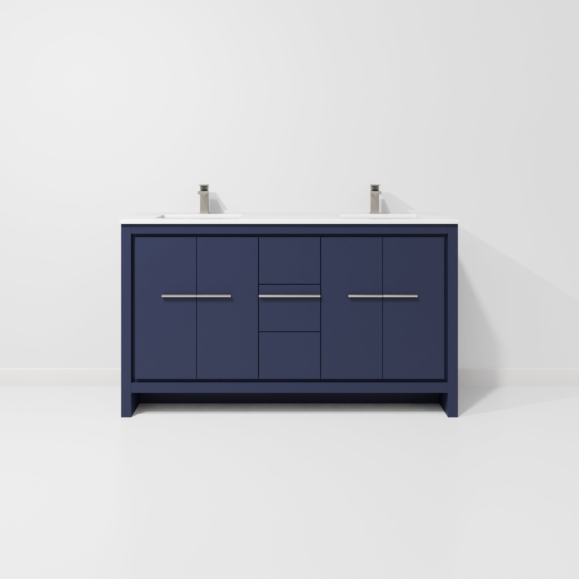 Elevate your bathroom with this elegant navy blue double vanity, thoughtfully designed to combine style, durability, and practical storage. Its cultured marble countertop resists scratches and stains for long-lasting beauty, while the included gun metal faucet adds a modern, high-end touch. Ideal for master baths or shared spaces, this vanity streamlines morning routines with soft-close cabinetry and ample organization.
