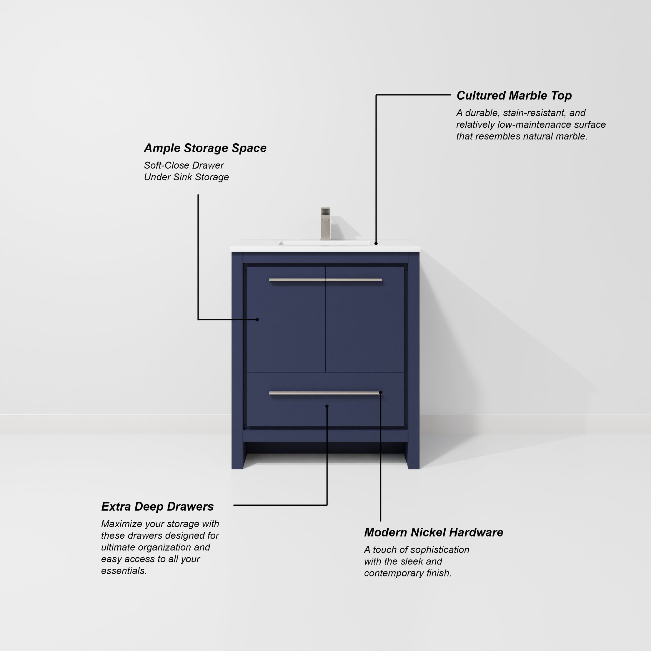- Finish & Material: Navy blue painted wood cabinet with a durable cultured marble countertop that resists scratches and stains for long-lasting performance