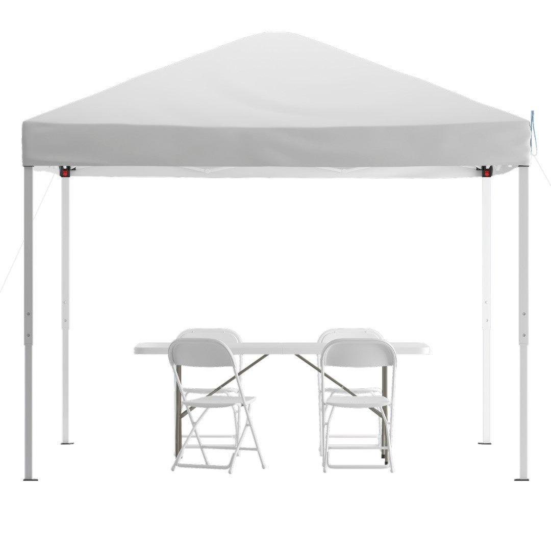 - Complete package: Includes one 10' x 10' blue pop-up canopy with carrying case, one 6-foot bi-fold folding table with handle, and four ready-to-use white folding chairs.