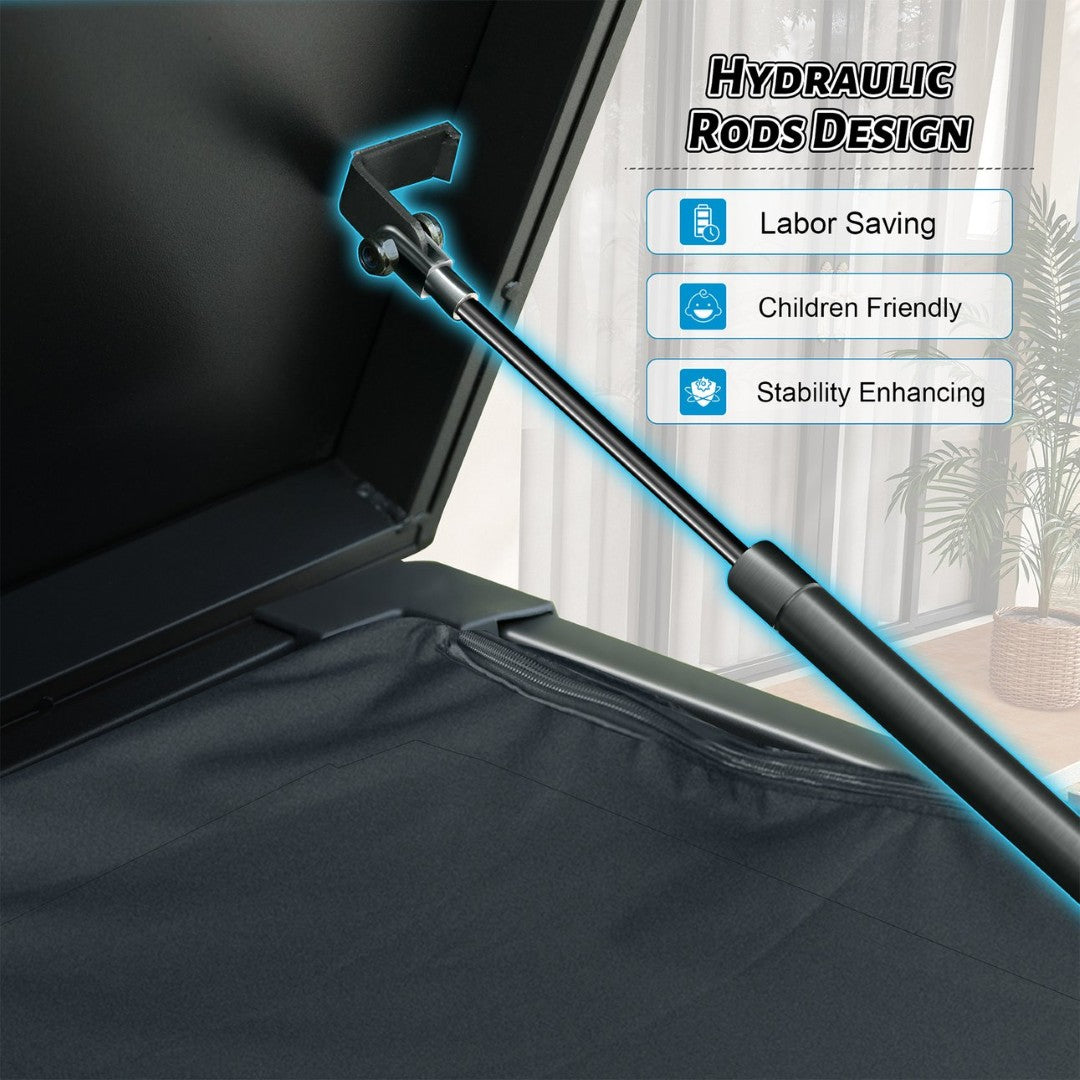 Store and protect your outdoor essentials with this durable, weather-resistant deck box designed for convenience, security, and smooth operation. Ideal for patios, decks, and poolside areas, it combines a sturdy metal frame with an Oxford fabric storage bag, hydraulic pistons for safe opening, and mobility features to make outdoor organization effortless.