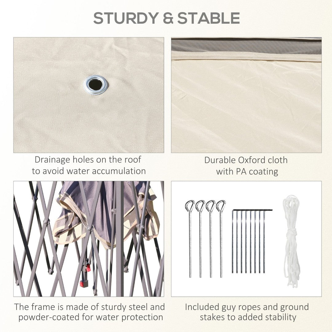 - Quick pop-up setup: Unfold the frame, attach the canopy, choose one of three height settings, stake or guy-rope it down—ready in minutes with no tools required. Includes a zippered carry bag for transport and storage.