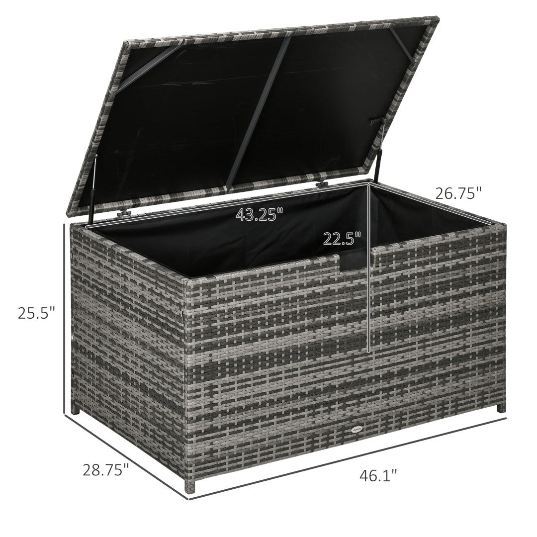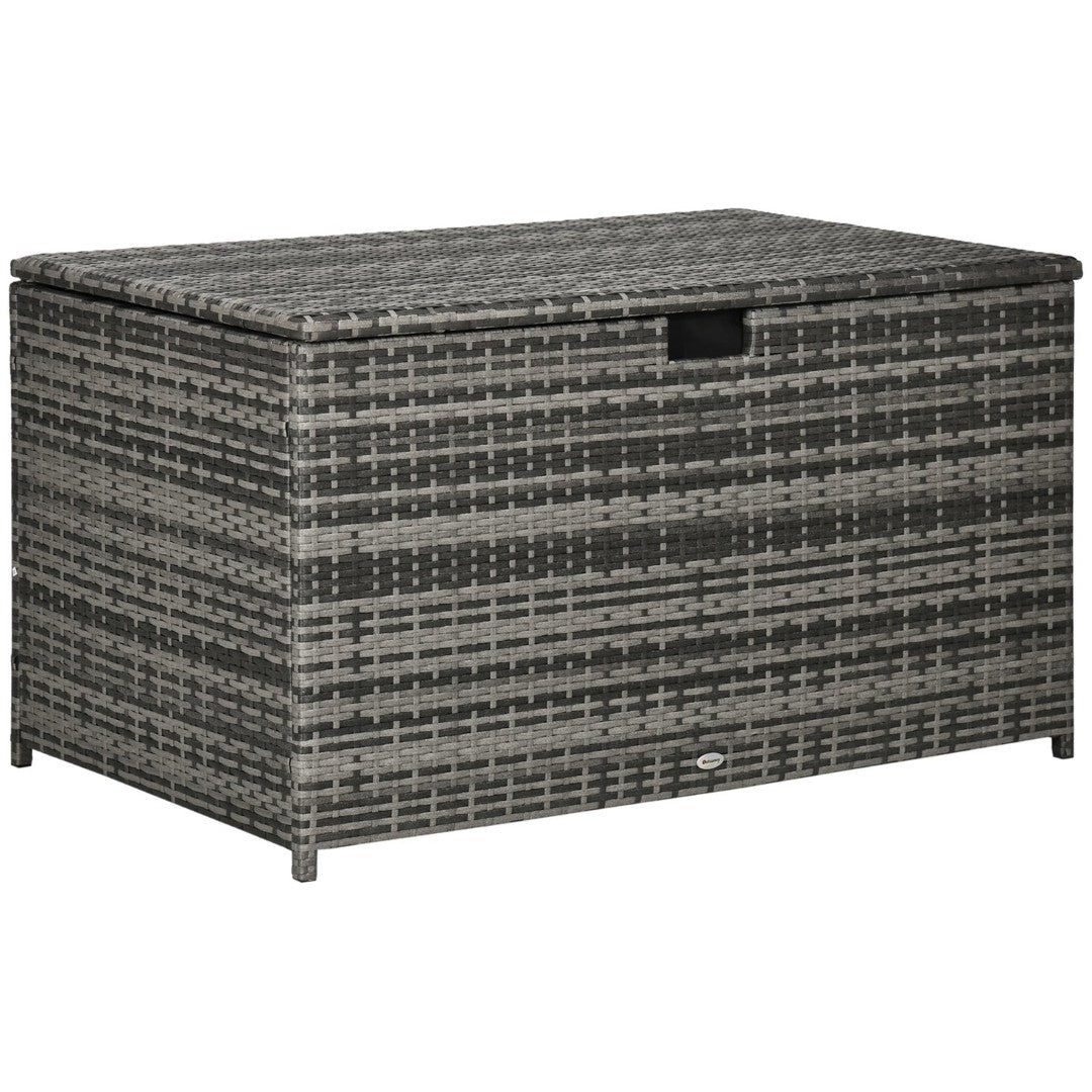 Keep your patio, pool area, or garage organized with this stylish, weather-ready rattan deck box. Designed to blend with outdoor furniture while providing a roomy, secure spot for cushions, pool supplies, garden tools, and seasonal items, it combines durable construction with user-friendly features for everyday convenience.