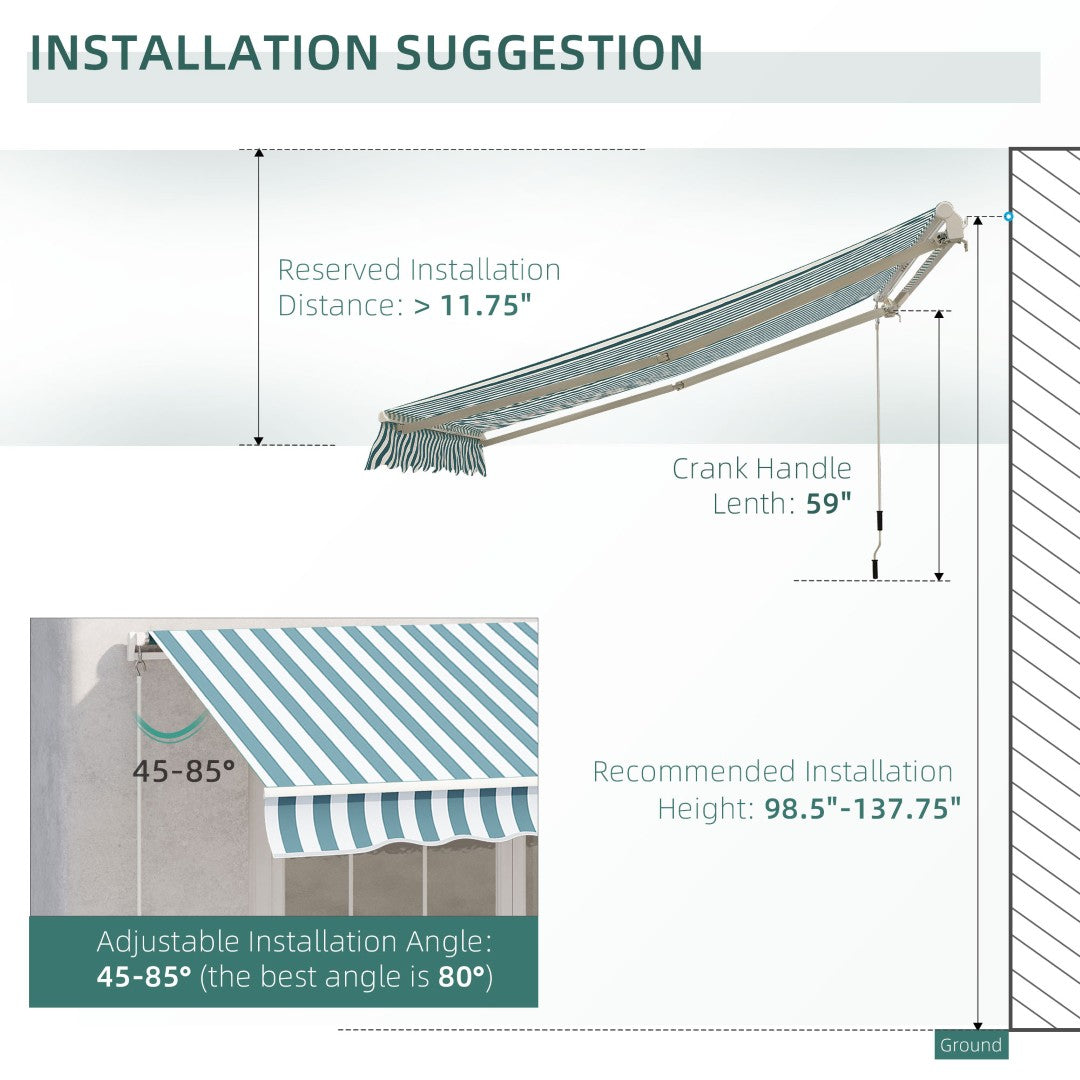 Keep your outdoor spaces cool, comfortable, and protected with this retractable patio awning—designed for easy manual operation, durable weather resistance, and versatile mounting on decks, balconies, doors, and windows. The heavy-duty aluminum and steel frame, UV- and water-resistant 280 g/m² polyester fabric with PU coating, and a 59" crank handle make it simple to adjust shade and reduce heat while maintaining a neat, low-profile appearance.