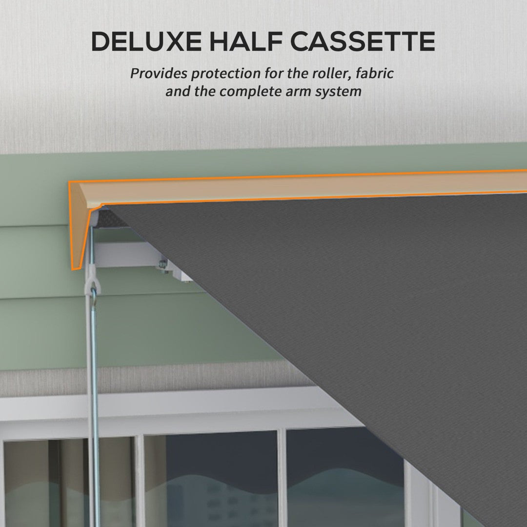 - Backyard Retractable Awning: When you open our retractable patio awning, you can sit outside in a cool spot free from glare. It's made of PA-coated polyester fabric, making it resistant to the elements and able to provide UV40+ sun protection.