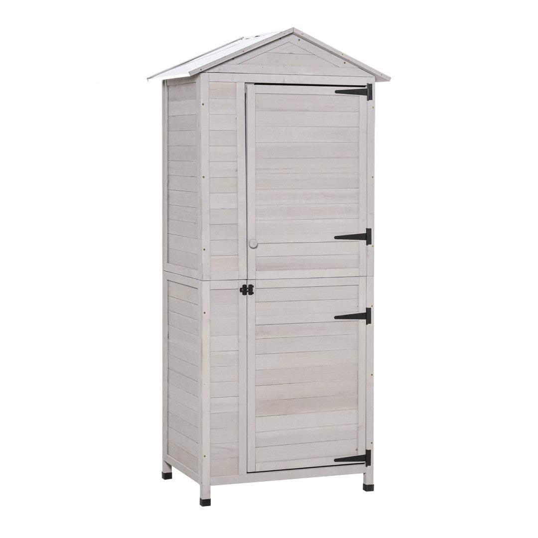 Keep your outdoor tools and garden gear organized, protected, and easy to access with this sturdy wooden storage cabinet. Crafted from solid fir wood and finished with exterior paint, the cabinet is raised off the ground and topped with a tilted tin roof to shed water and resist the elements. Thoughtfully arranged shelving and a secure door with magnetic latch and lock make it a practical, attractive addition to patios, decks, and yards.