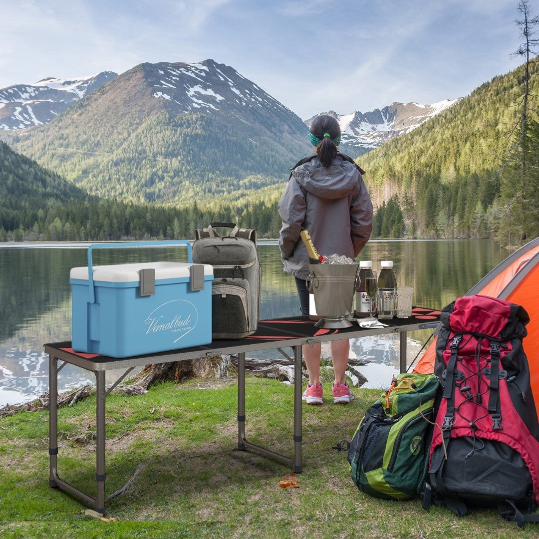 - Outdoor Folding Portable Table: Offering an extra large size that folds down compact when you need to move it, our portable camping table comes with a beer pong pattern, a handle and fits in the trunk of your car.