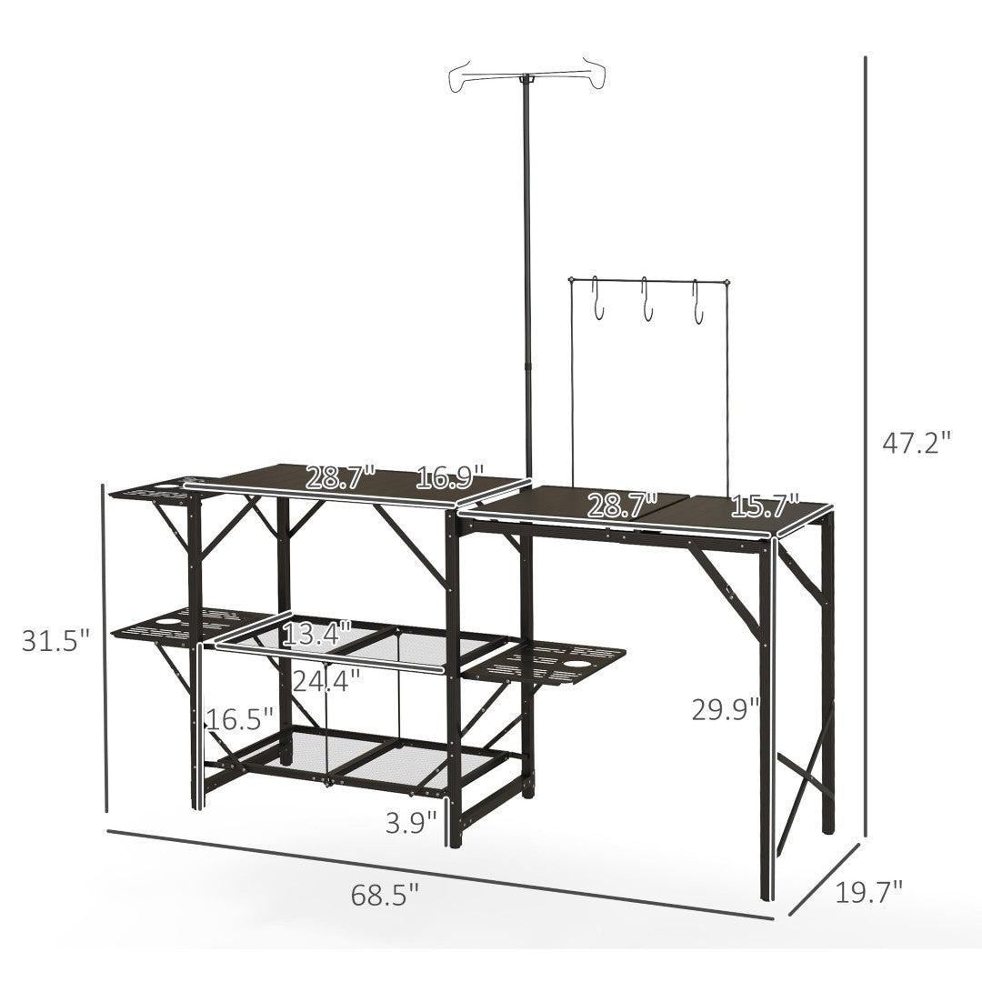 - Spacious, multi-shelf design: Two main tables, two bottom shelves, and three foldable side shelves provide ample workspace and storage for stoves, prep items, and food supplies.