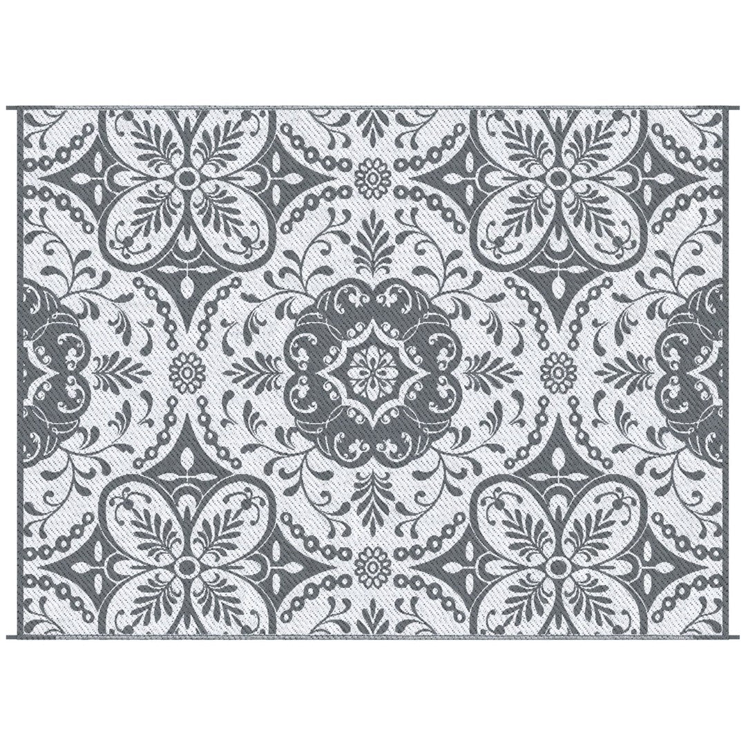 Bring durable style and easy care to any outdoor space with this reversible, waterproof patio rug. Lightweight and portable, it’s designed for patios, decks, RVs, picnics, and beach trips — offering a soft underfoot look with the practical benefits of polypropylene construction. The gray-and-white floral pattern adds a boho touch while the reversible design and simple cleaning make it a low-maintenance choice for busy outdoor living.