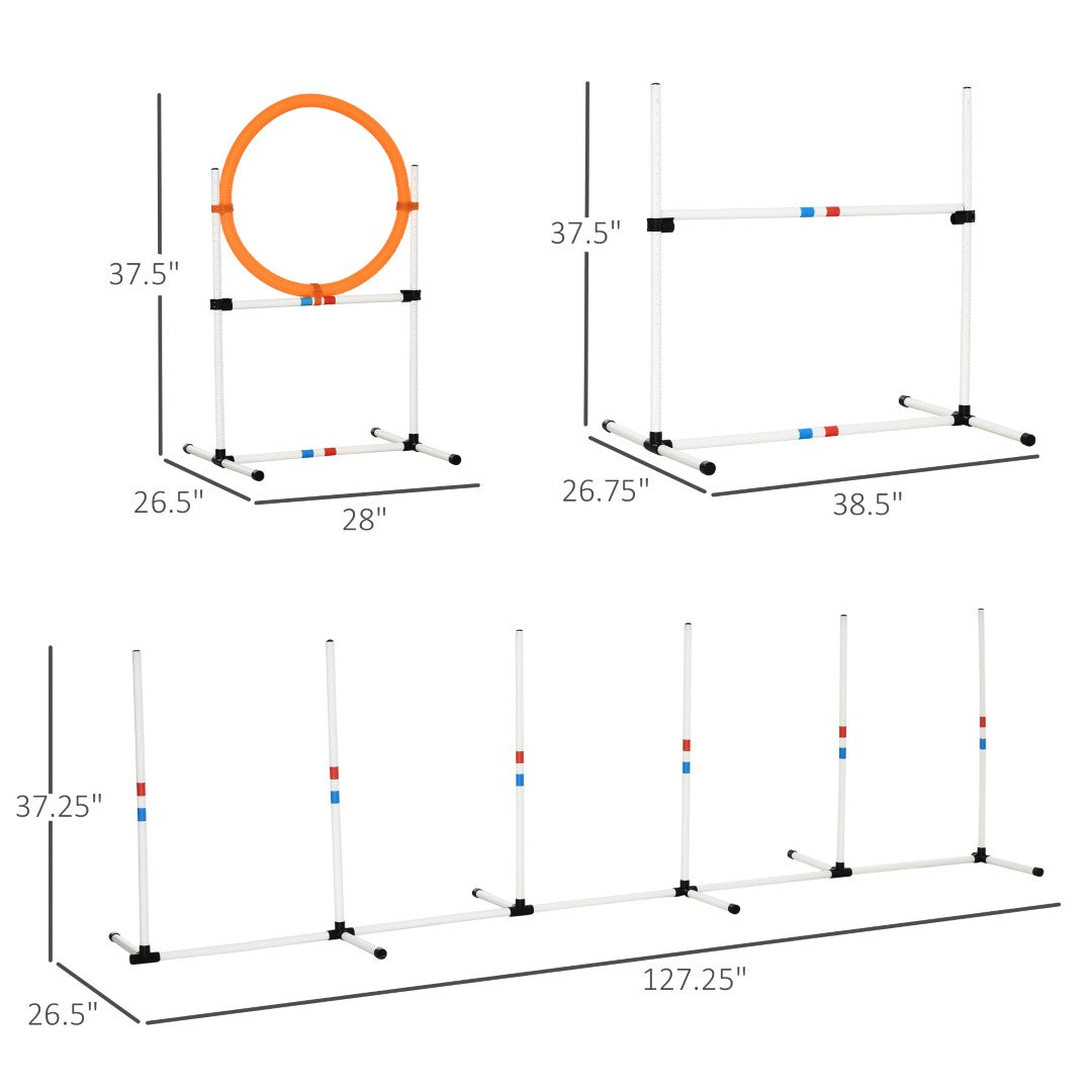 - Includes: 1 adjustable high jump, 1 jump hurdle (adjustable heights), and 6 adjustable weave poles plus a carry/storage bag for easy transport.