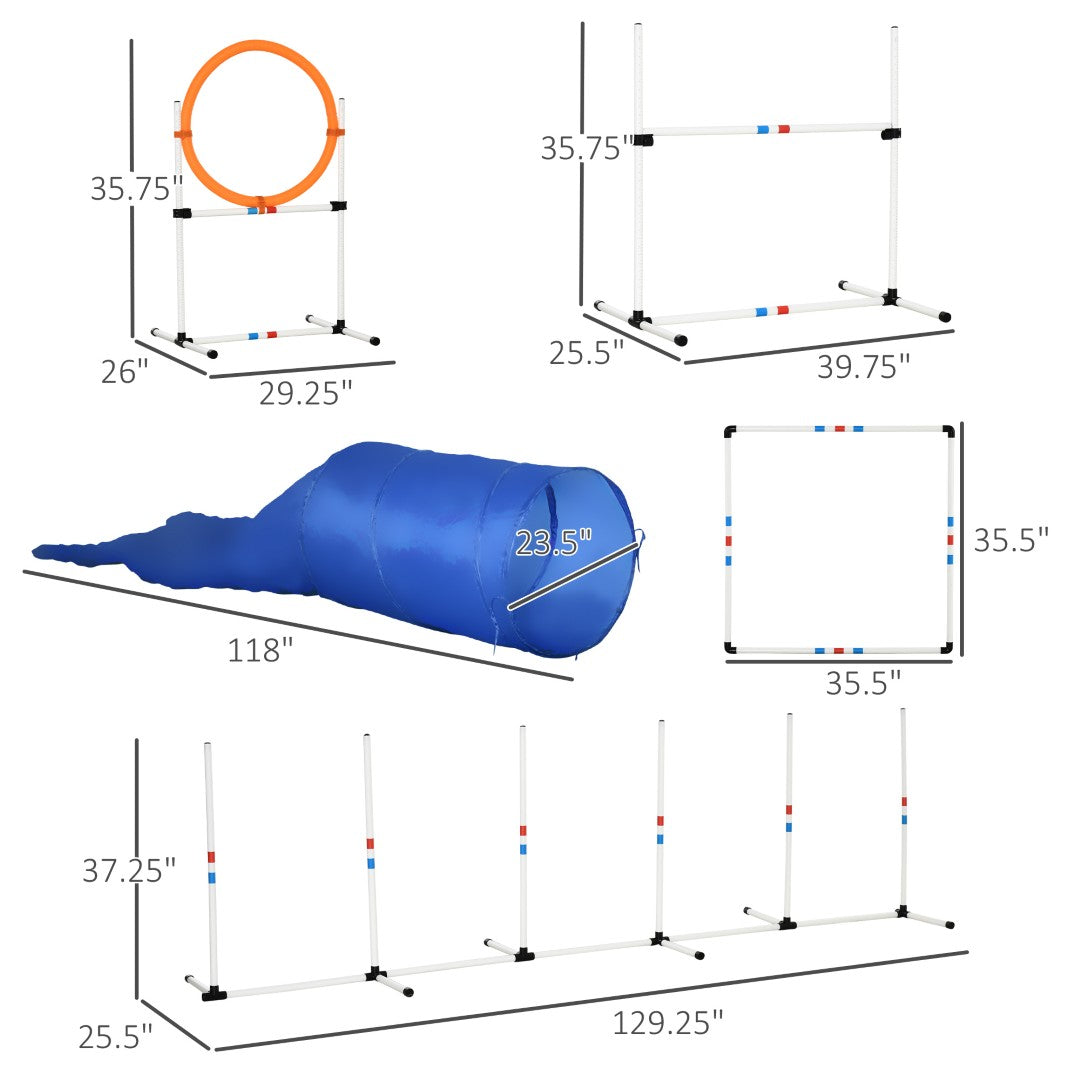 - Features a complete 5-piece course: Includes a tunnel, adjustable high jump (ring), hoop, weave poles, and a square pause box to recreate authentic agility exercises and varied training sessions.