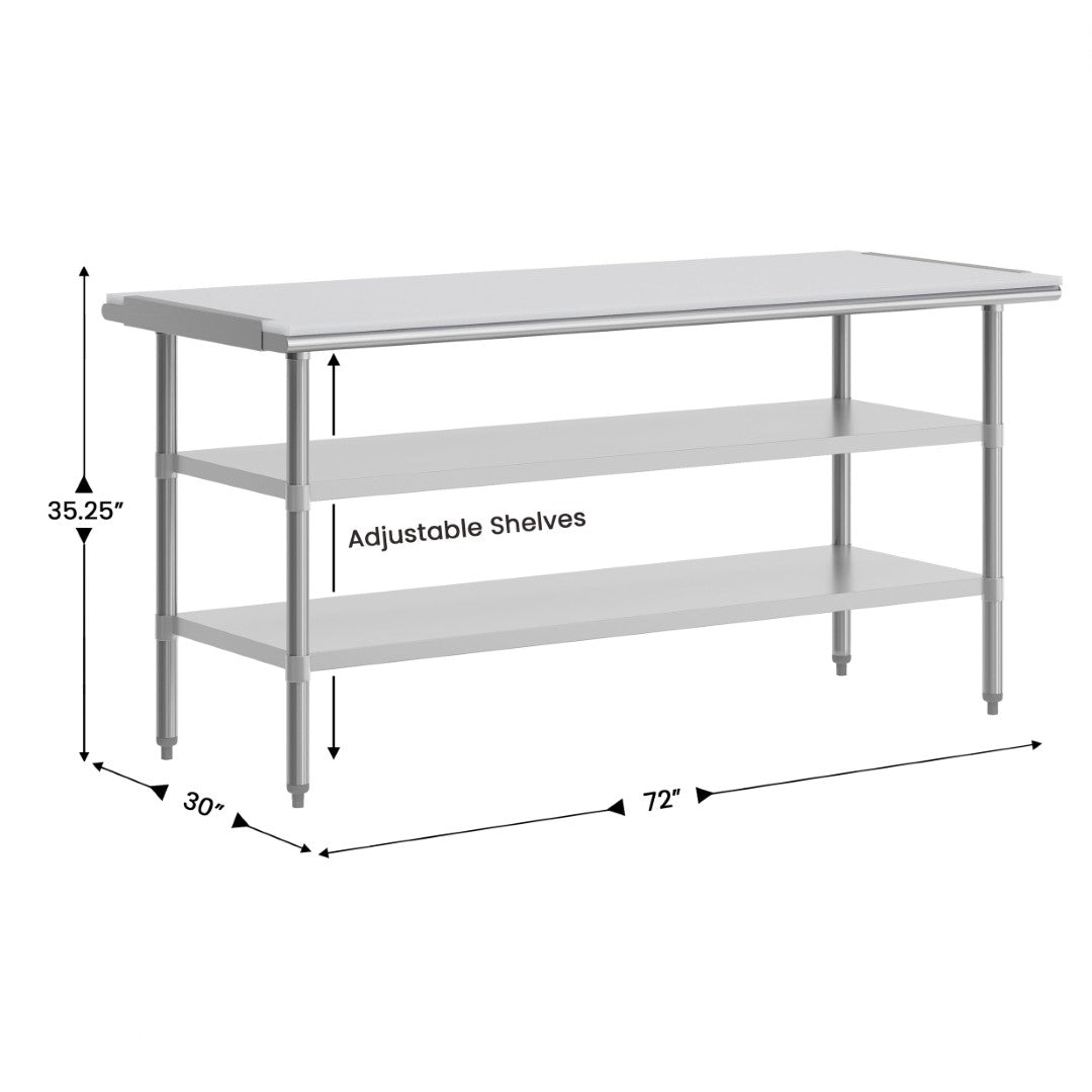 - Key Dimensions: 72"W x 30"D x 34.5"H — (prominent work surface sized for large prep tasks)