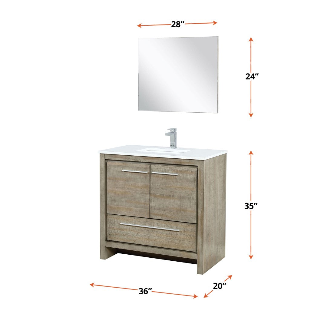- Dimensions: Vanity nominal size 36 in. W x 20 in. D; overall product dimensions 40 L x 24 W x 40 H; included mirror 28 in. W x 24 in. H.