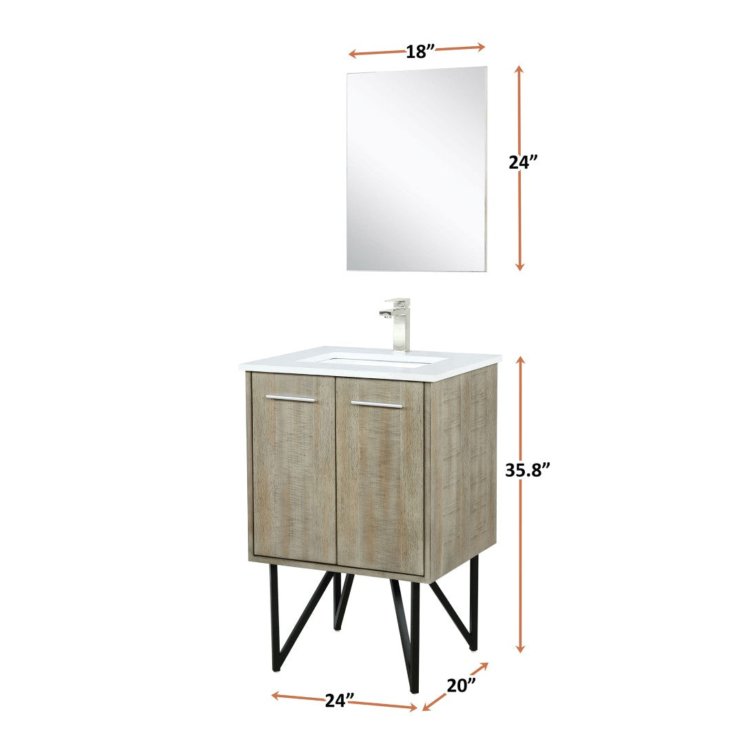 - Dimensions: Vanity footprint 24 in. W x 20 in. D; Mirror 18 in. W x 24 in. H; Overall product dimensions: 28 L x 22 W x 4 H.