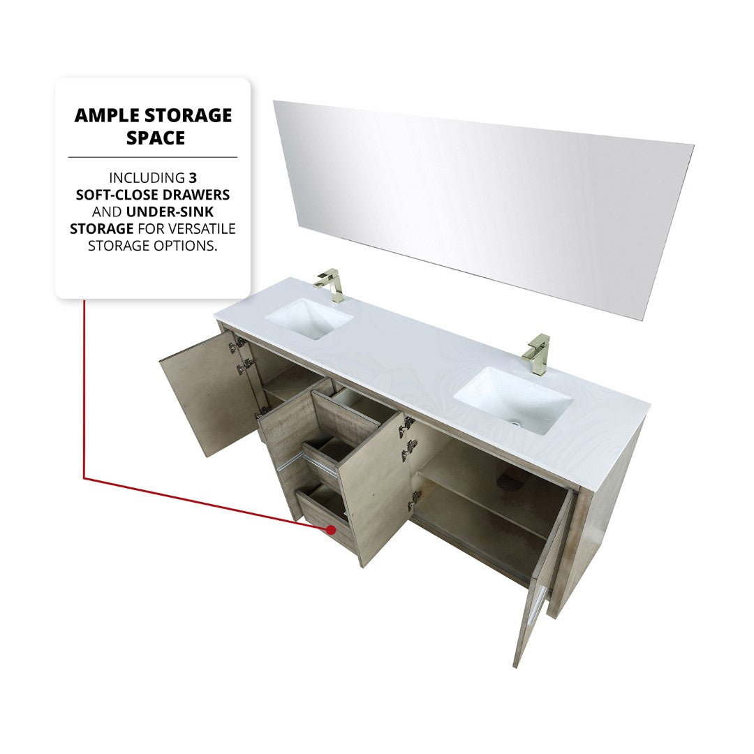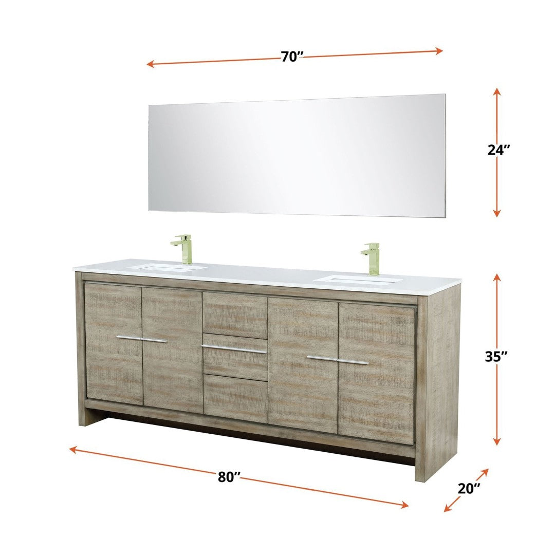 - Dimensions: Overall vanity width 80 in. x depth 20 in.; included mirror 70 in. W x 24 in. H; product dimensions listed: 75 L x 28 W x 4 H.