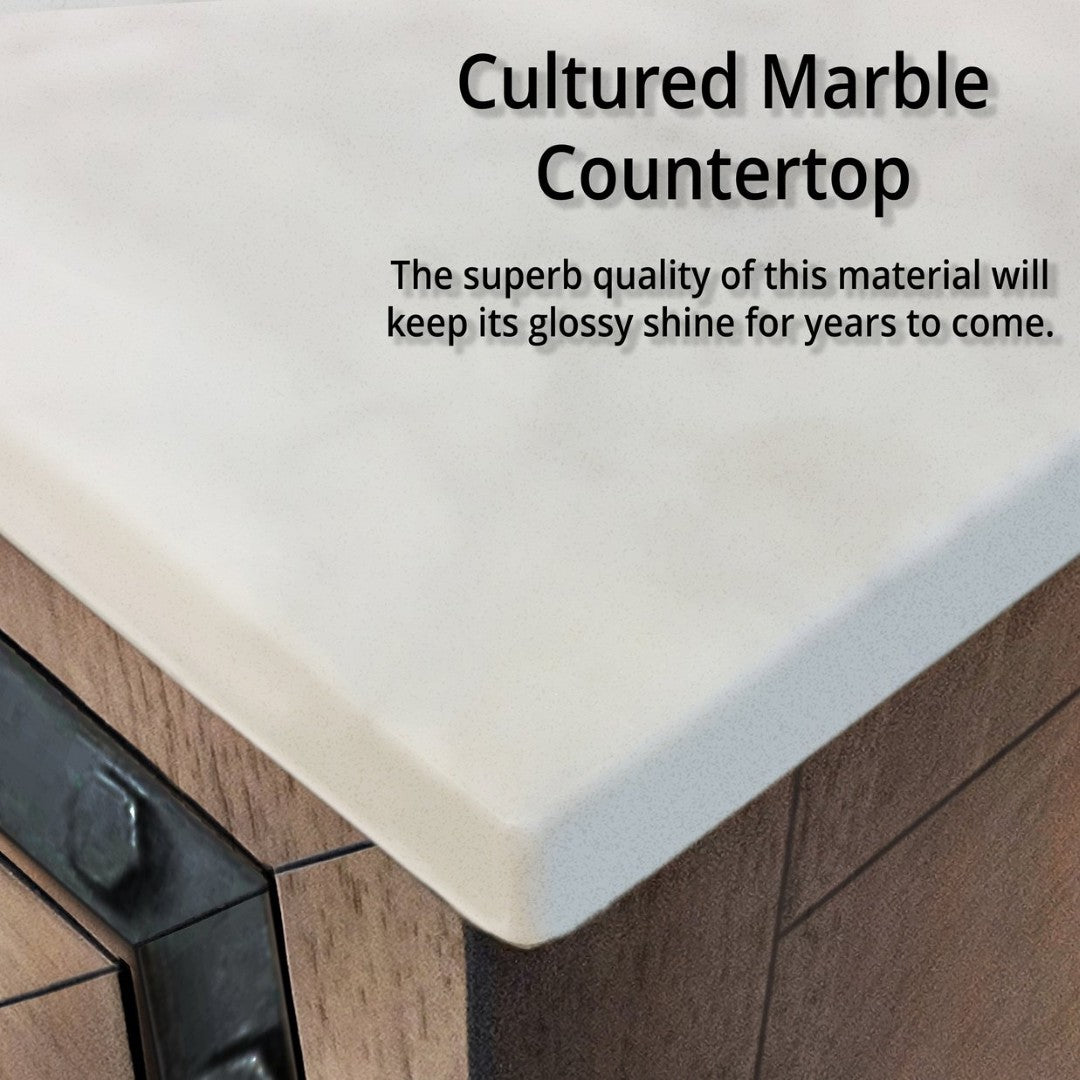 - Finish & Materials: Rustic barnwood cabinet construction with a cultured marble countertop that resists scratches and stains for long-lasting beauty.