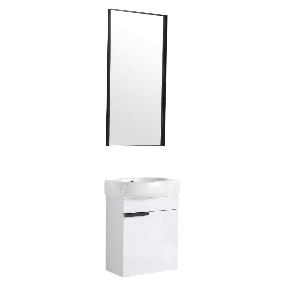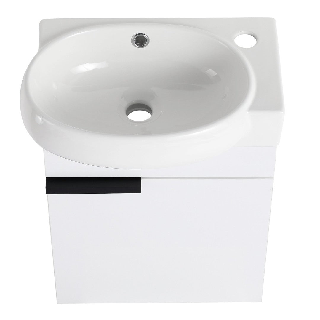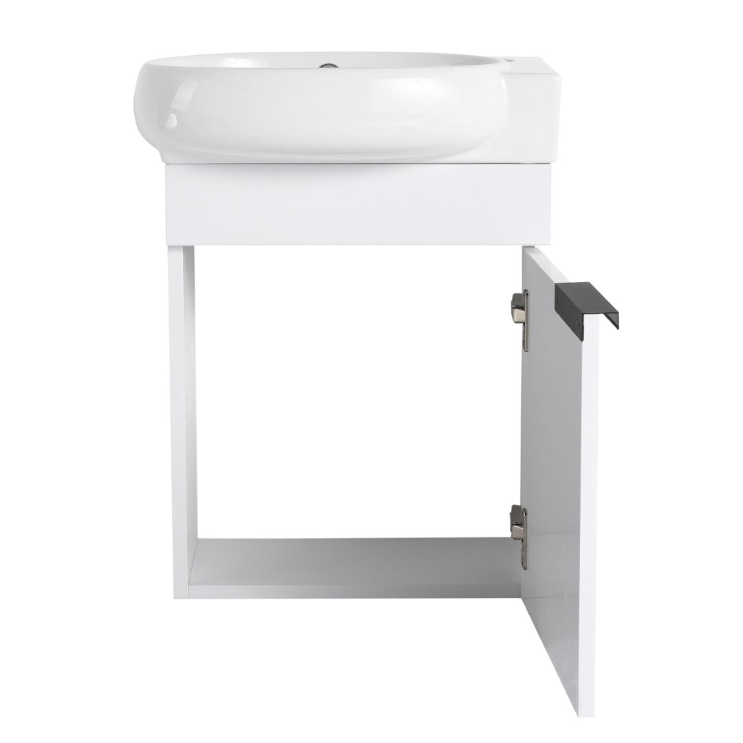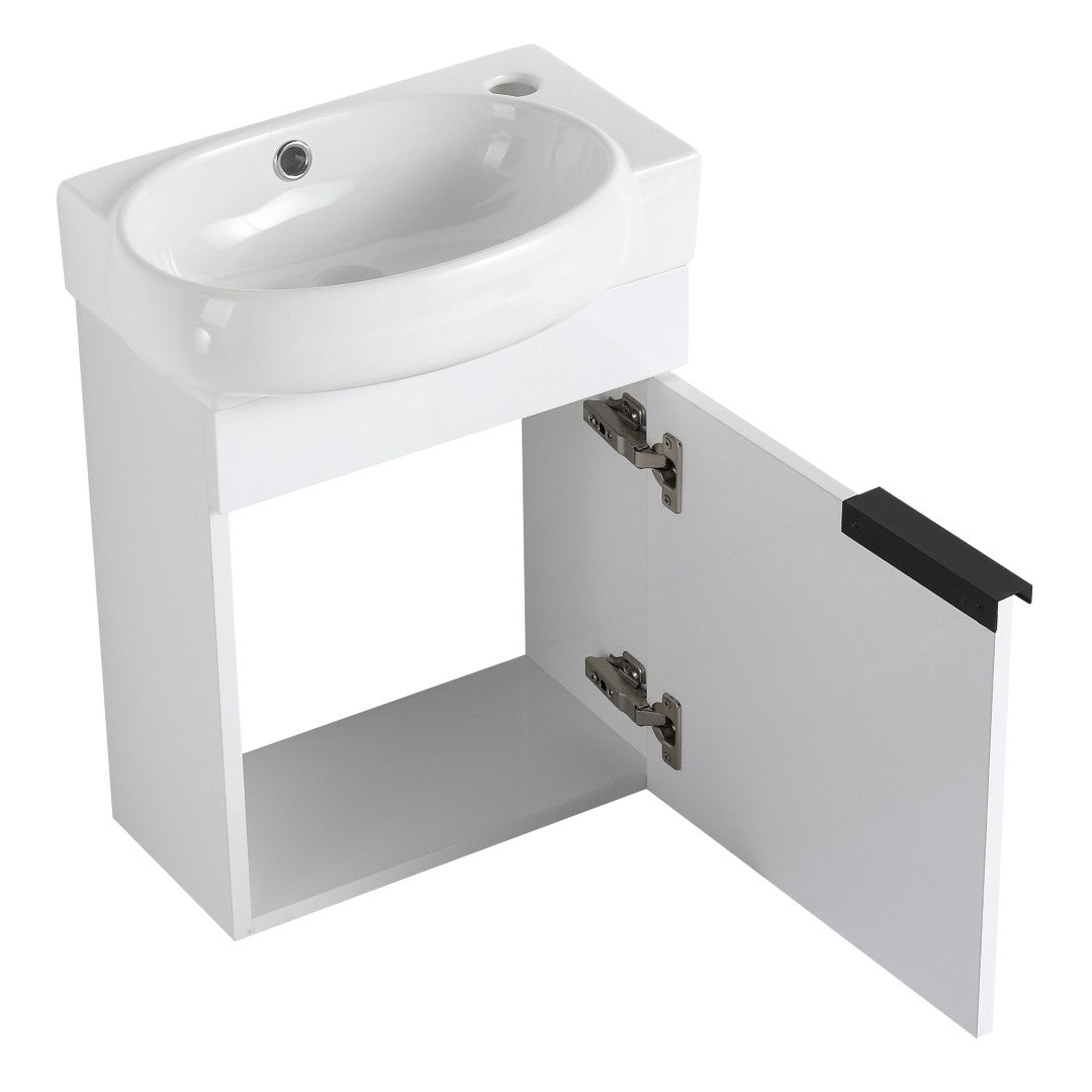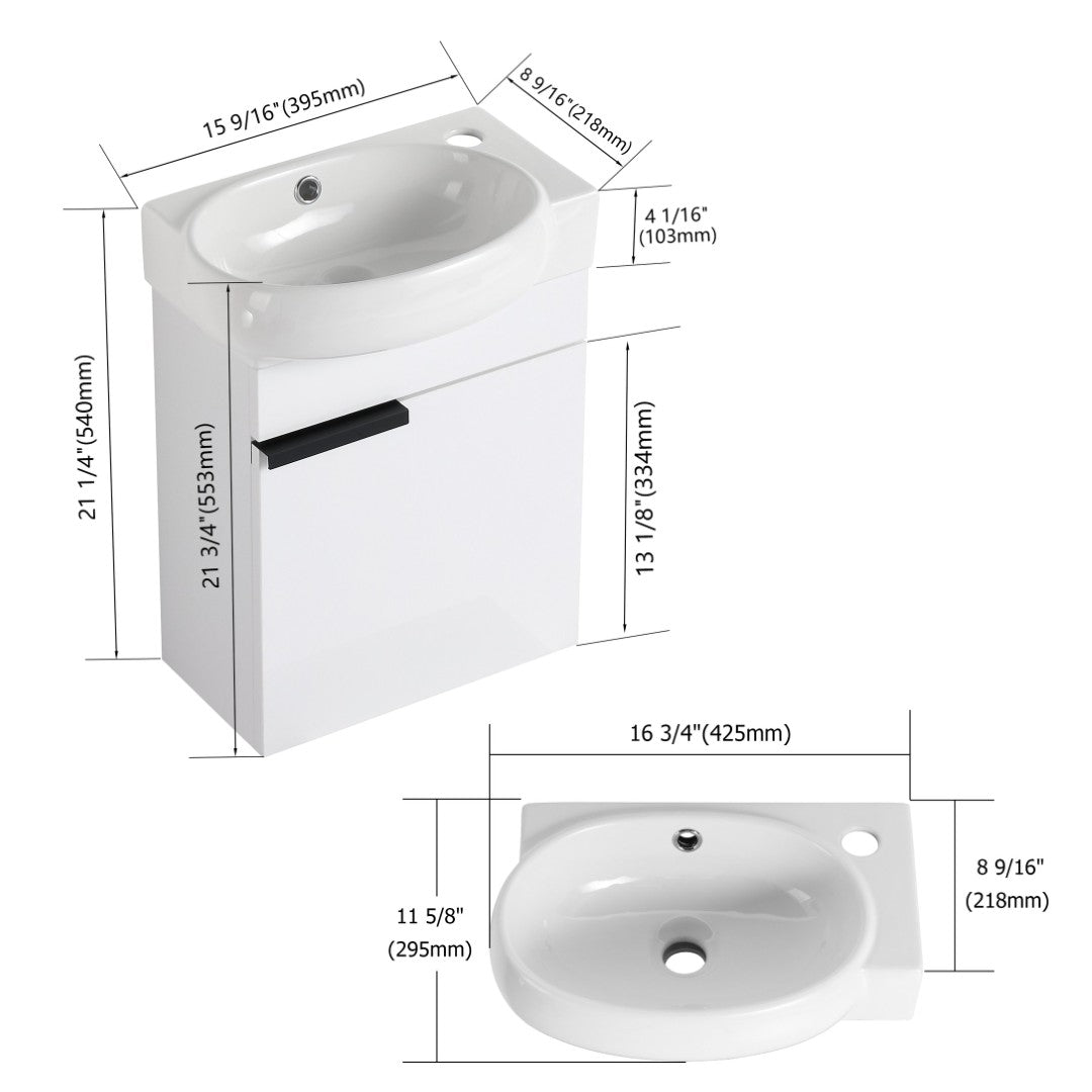 - What’s Included: Vanity cabinet, ceramic basin, and metal handle. (Faucet, drains, P-trap, backsplash, and mounting bracket are not included.)