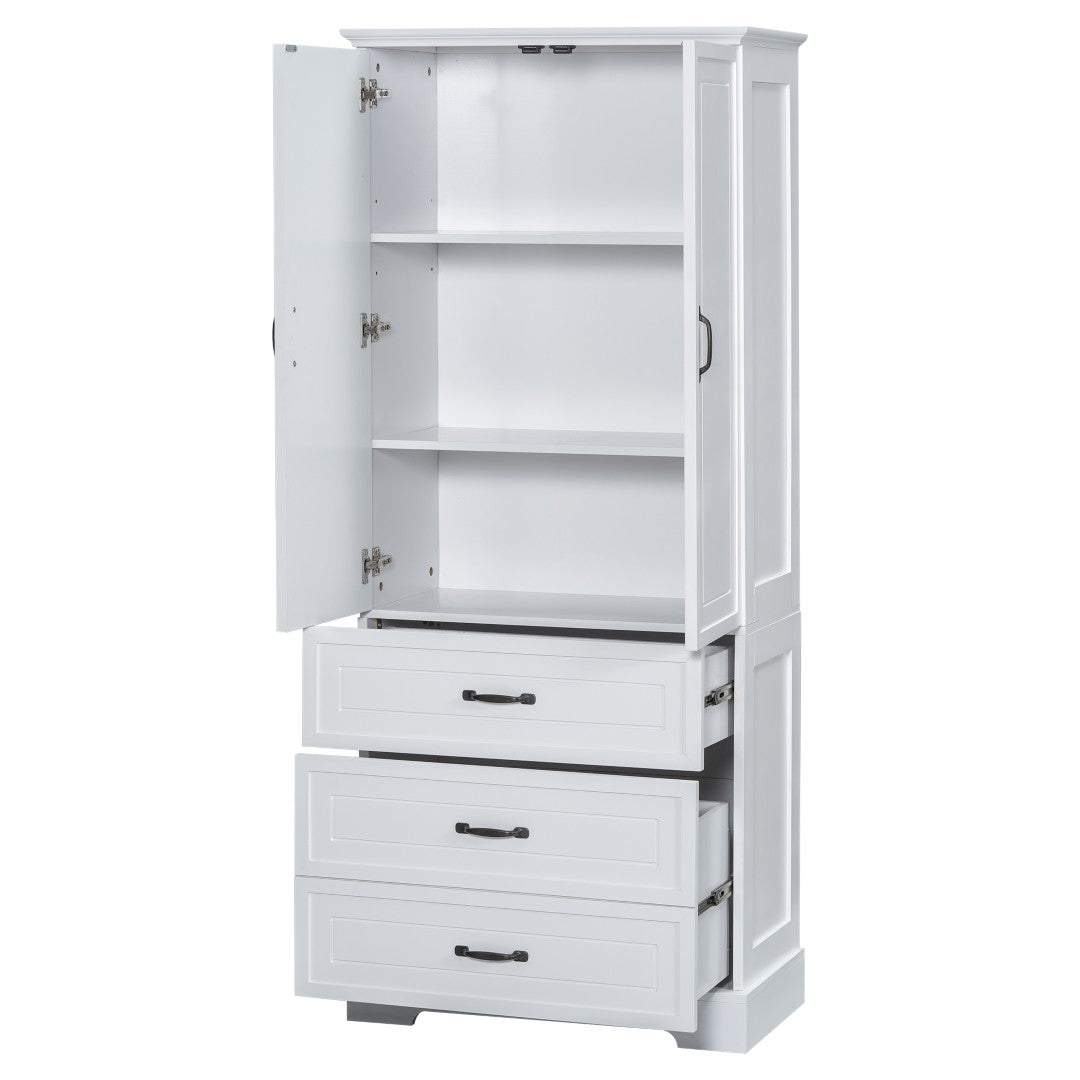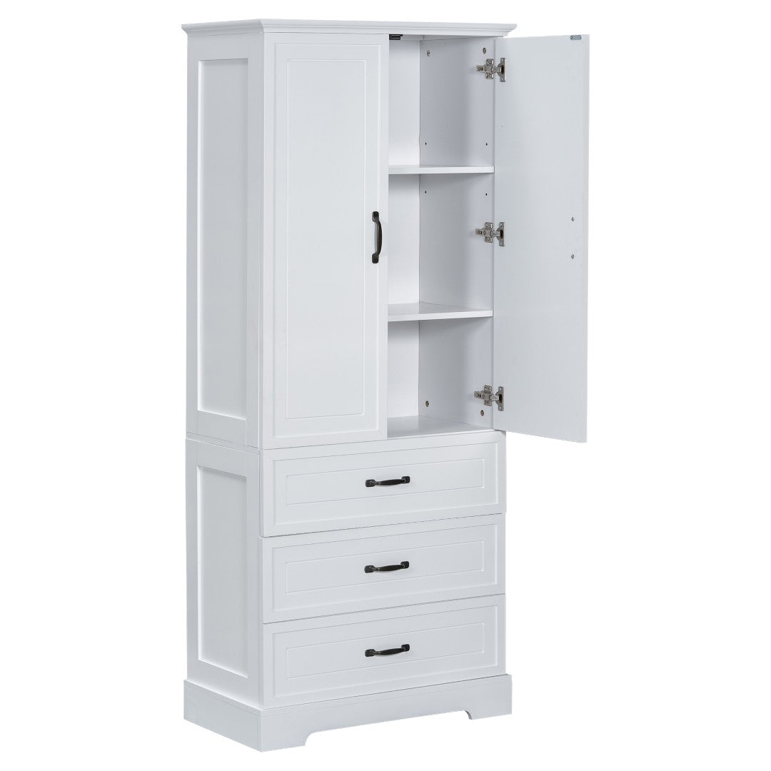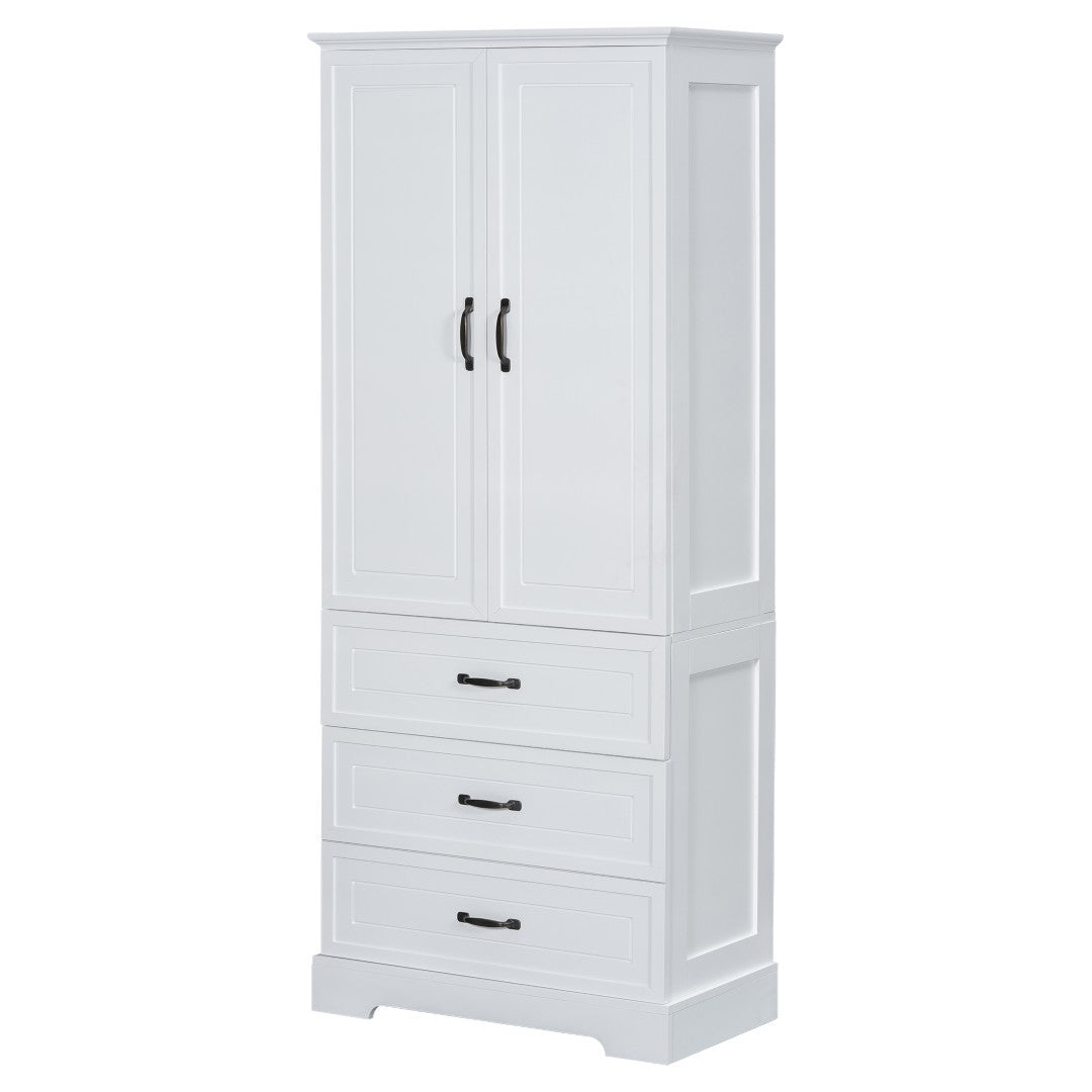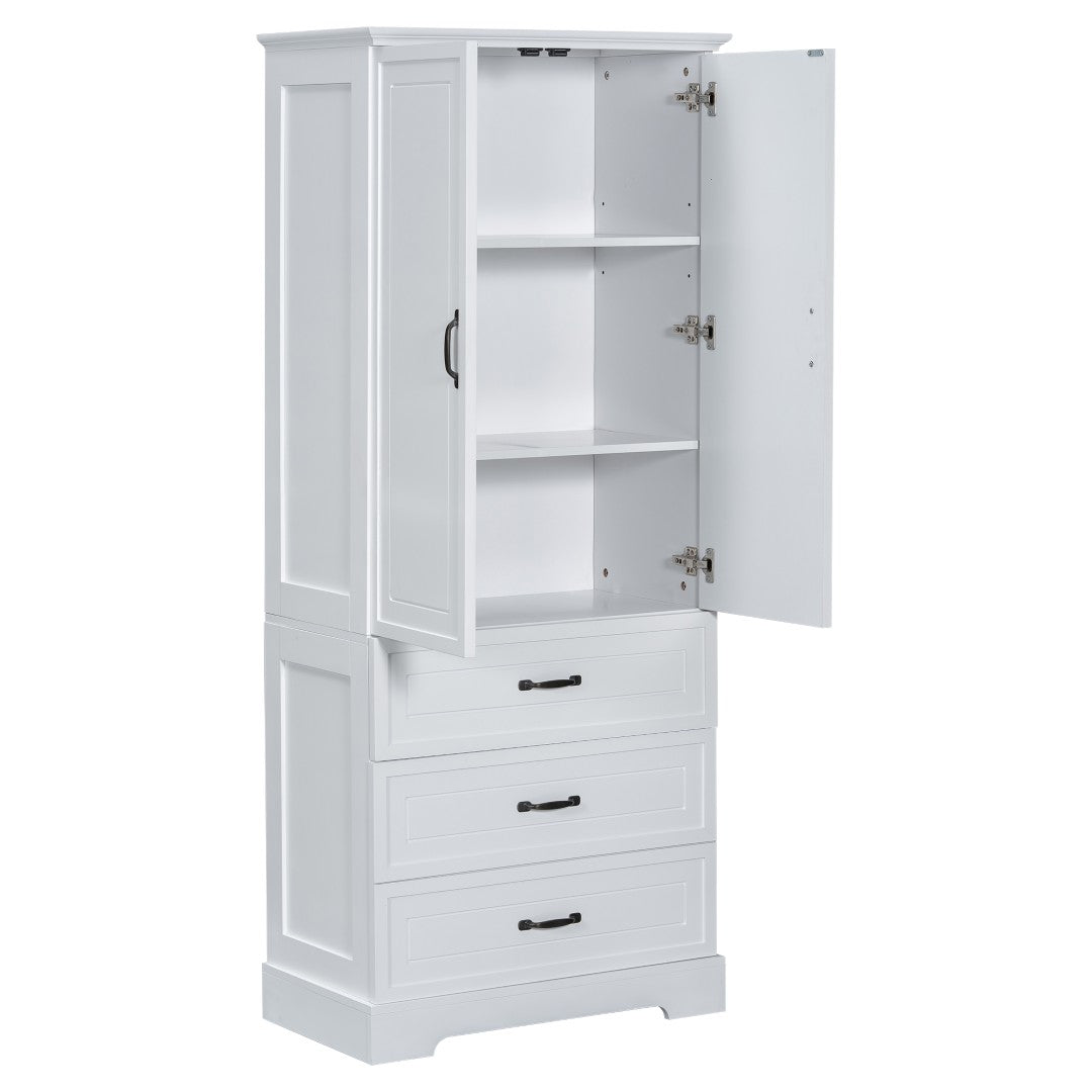 Organize your bathroom with style and efficiency using this tall, slim storage cabinet. Its clean white finish, contrasting black handles, and modern rectangular silhouette deliver a contemporary look while maximizing vertical storage in small spaces. Built with practical features like adjustable shelving, roomy drawers, and secure magnetic doors, this cabinet keeps toiletries, linens, and everyday essentials neatly stowed and easy to access.
