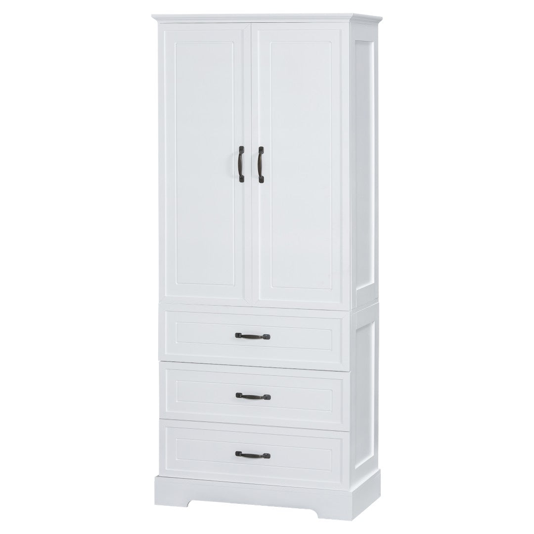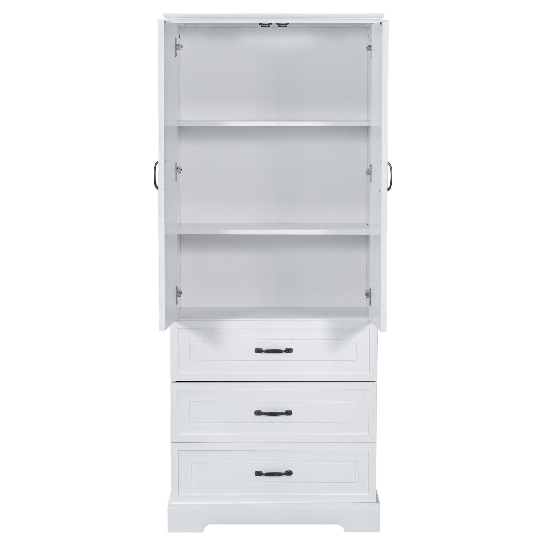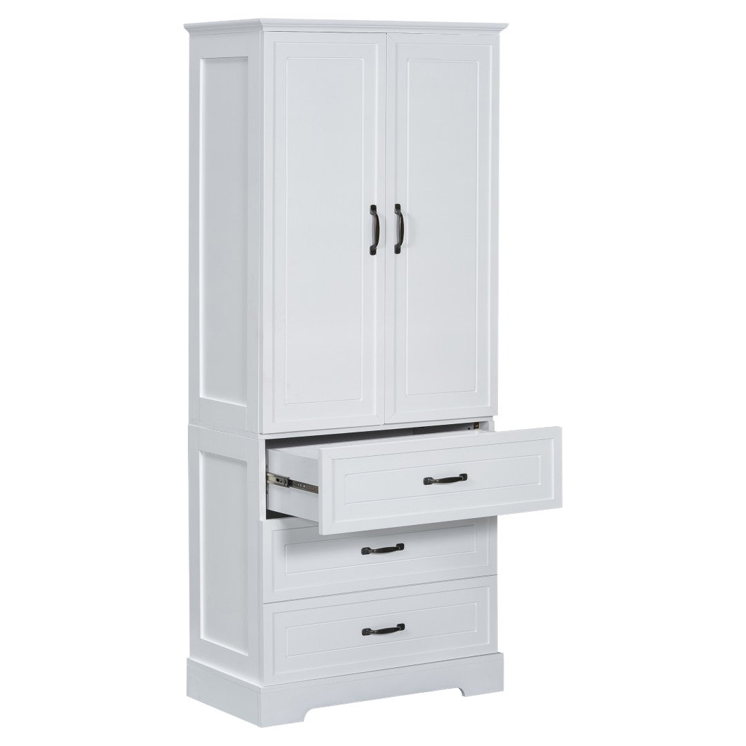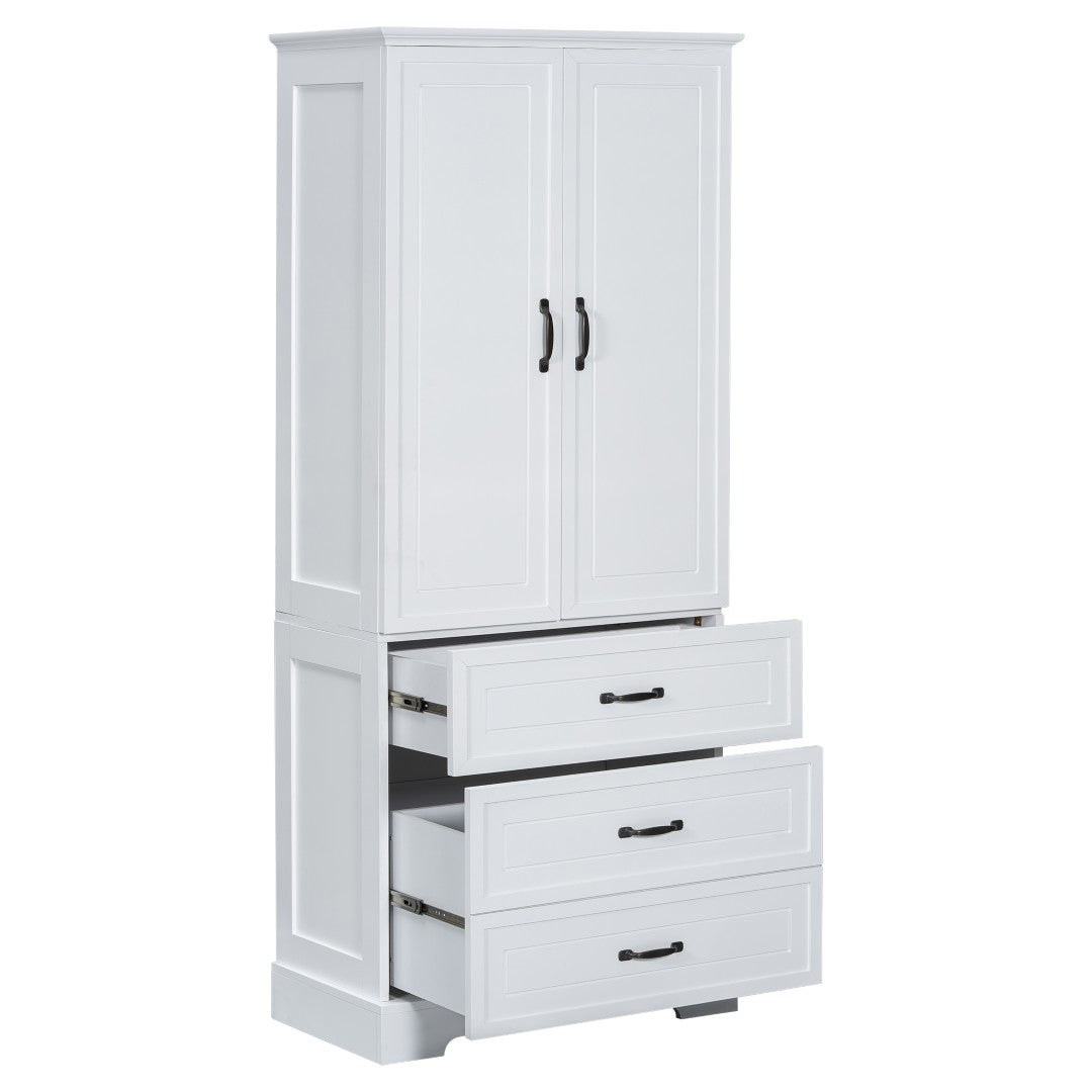Organize your bathroom with style and efficiency using this tall, slim storage cabinet. Its clean white finish, contrasting black handles, and modern rectangular silhouette deliver a contemporary look while maximizing vertical storage in small spaces. Built with practical features like adjustable shelving, roomy drawers, and secure magnetic doors, this cabinet keeps toiletries, linens, and everyday essentials neatly stowed and easy to access.