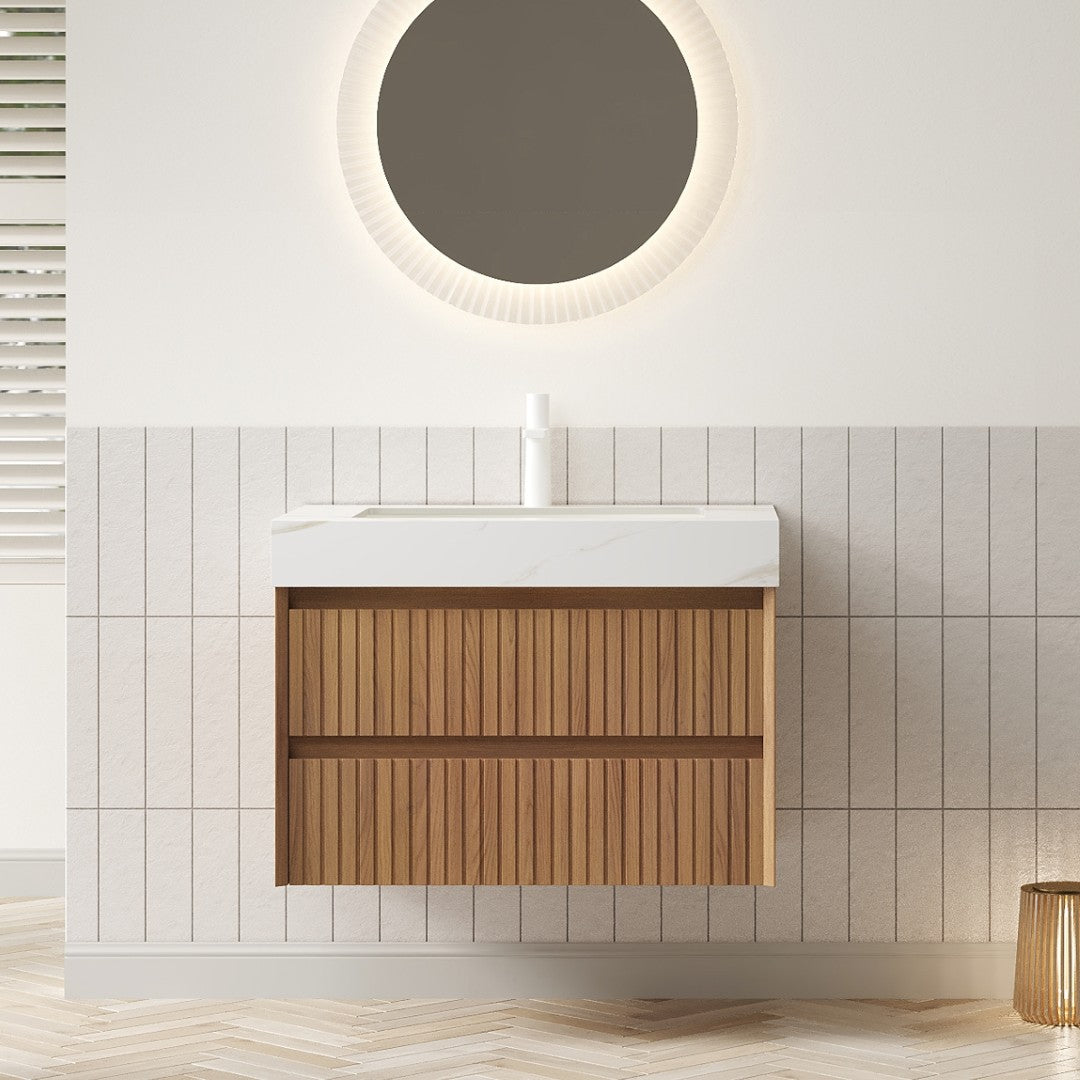 Elevate your bathroom with a refined, pre-assembled wall-mounted vanity that pairs a luxe Calacatta Gold sintered stone top with a smooth ceramic undermount basin and warm brown oak woodgrain cabinetry. Designed for modern convenience and lasting performance, this compact 30" vanity delivers marble-like elegance, practical storage, and quiet, soft-close functionality—ideal for small to medium bathrooms or powder rooms.
