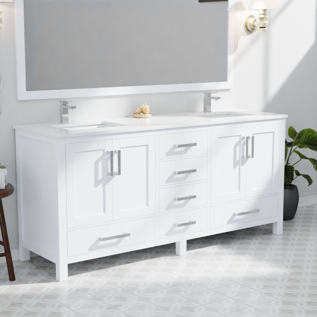 Upgrade your bathroom with this elegant White Double Bath Vanity, designed for both style and everyday functionality. The clean white finish and cultured marble top create a polished, spa-like look, while the generous storage and included faucet set make installation and daily use effortless. Ideal for busy households, this vanity balances durable materials with thoughtful details like soft-close drawers and a scratch-resistant countertop.