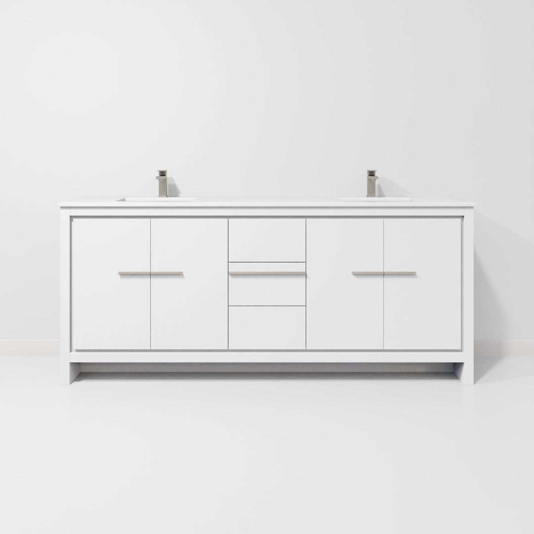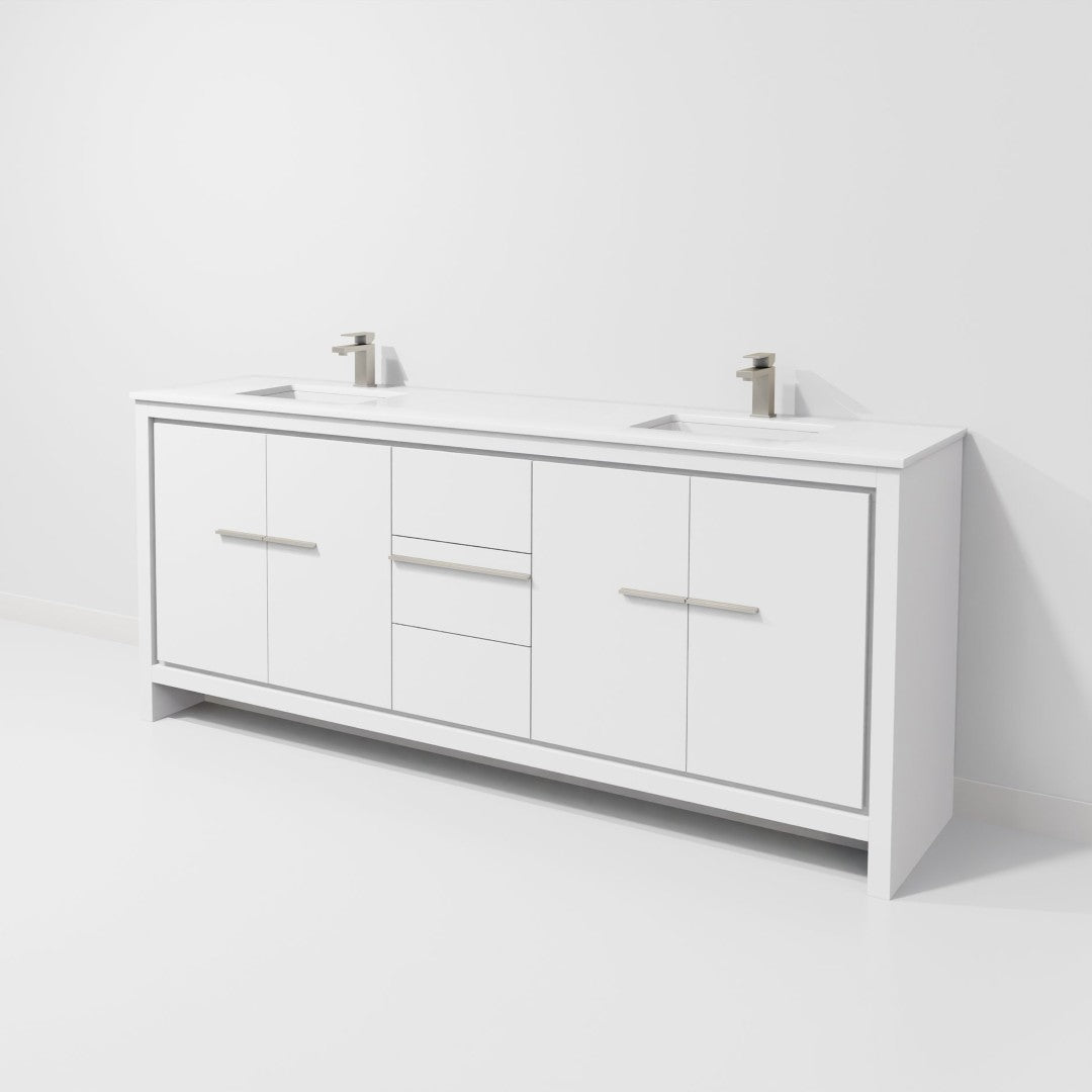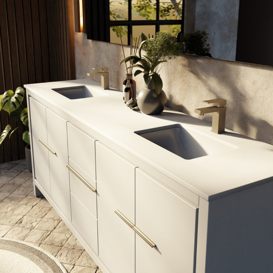 This elegant white double bathroom vanity combines classic styling with modern functionality to elevate your bath space. Designed for ample storage and durable daily use, it pairs a cultured marble top with a gun metal Balzani faucet set for a refined, cohesive look. Ideal for shared bathrooms, remodels, or new builds where both aesthetics and practicality matter.