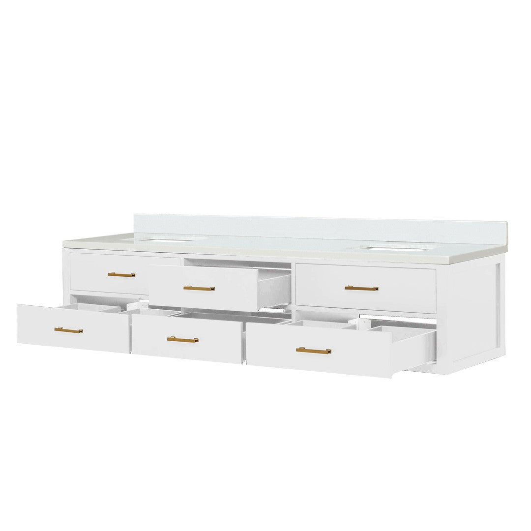 - Finish & Top: Crisp white finish with durable white quartz countertop for stain and scratch resistance
