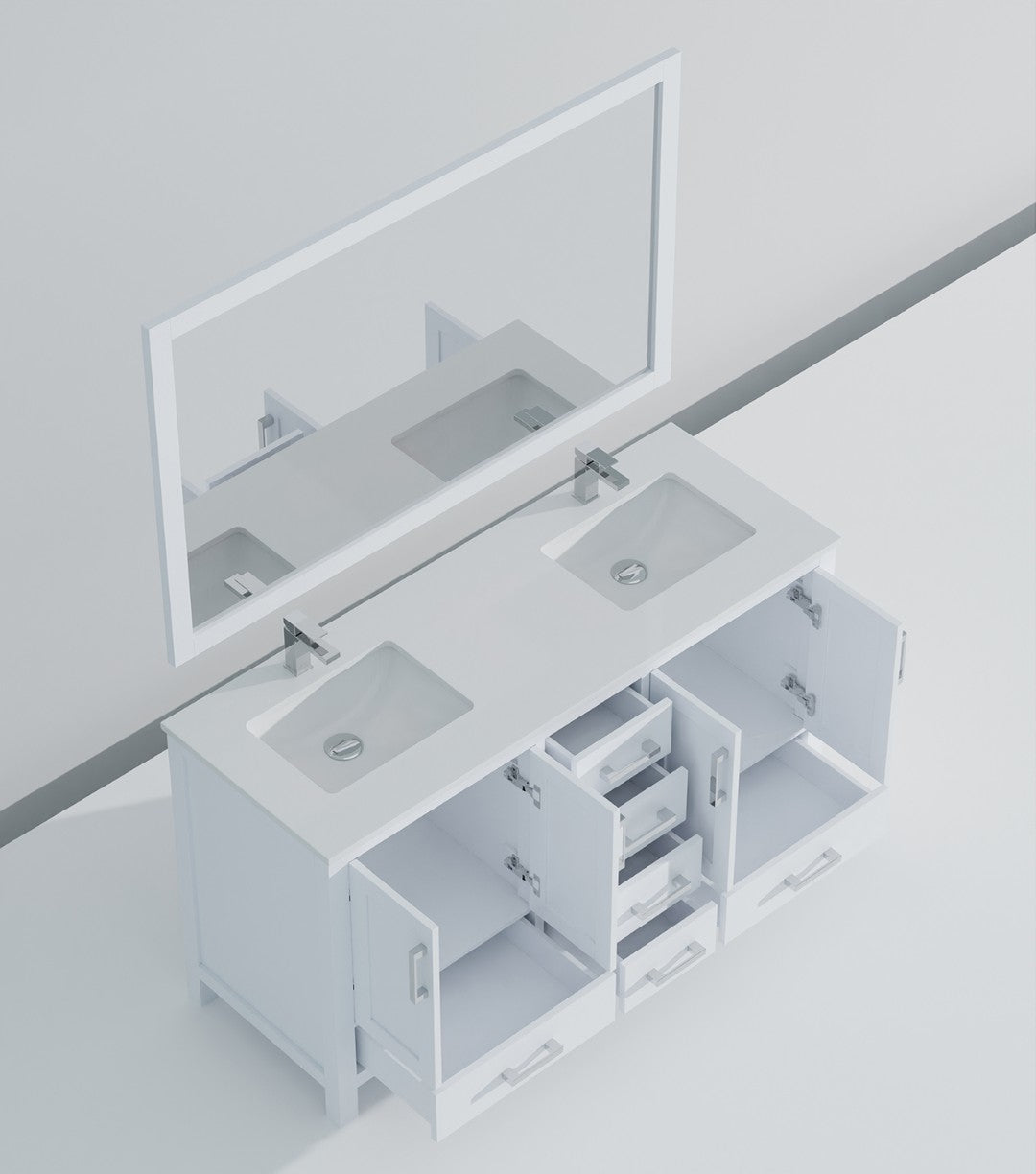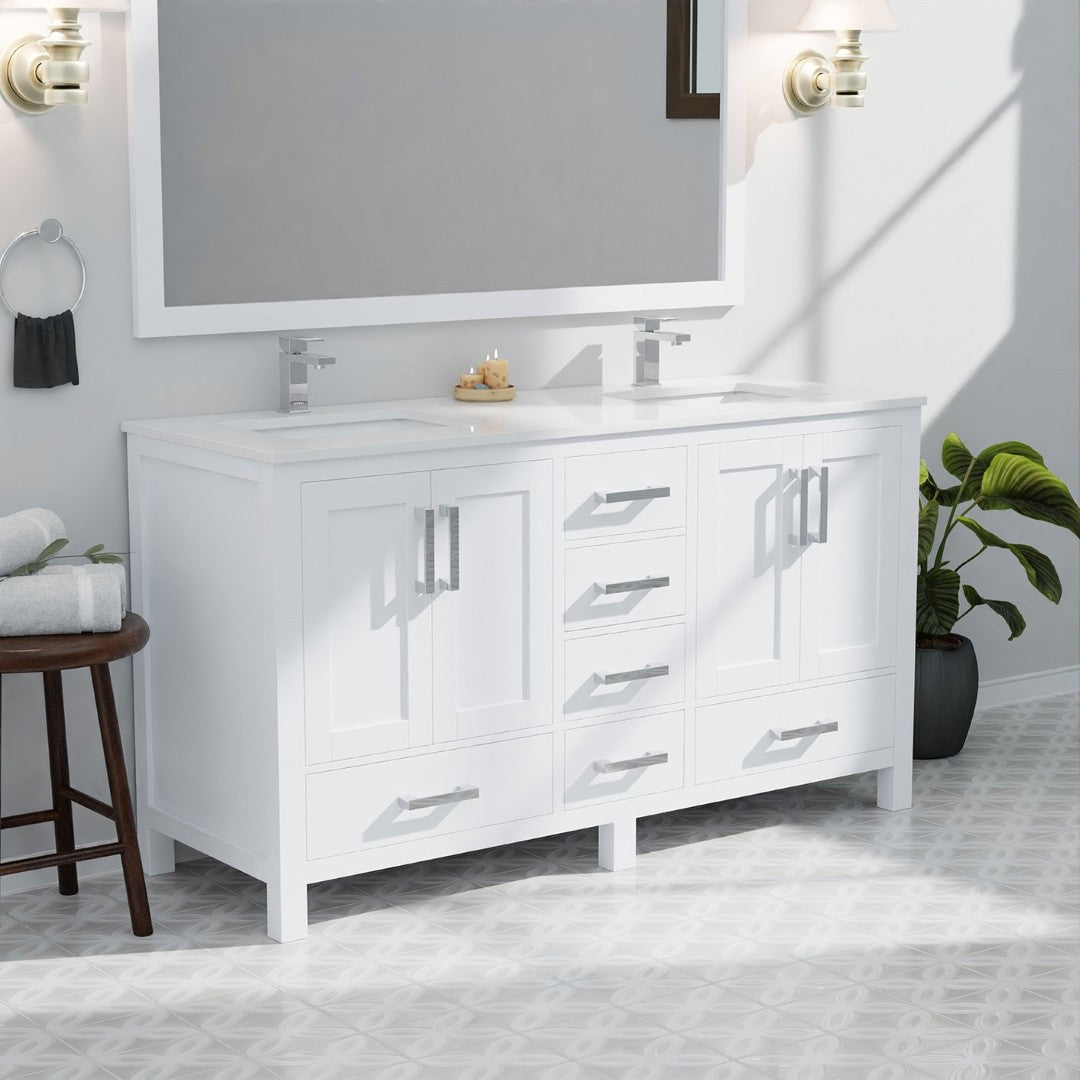 - Finish & Material: Classic white painted wood cabinet with a durable white quartz countertop