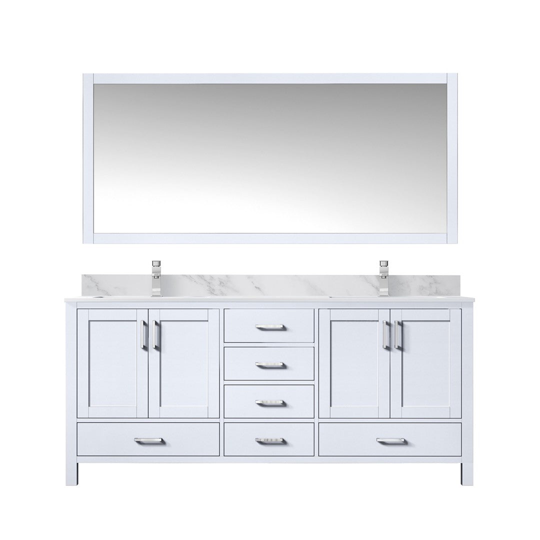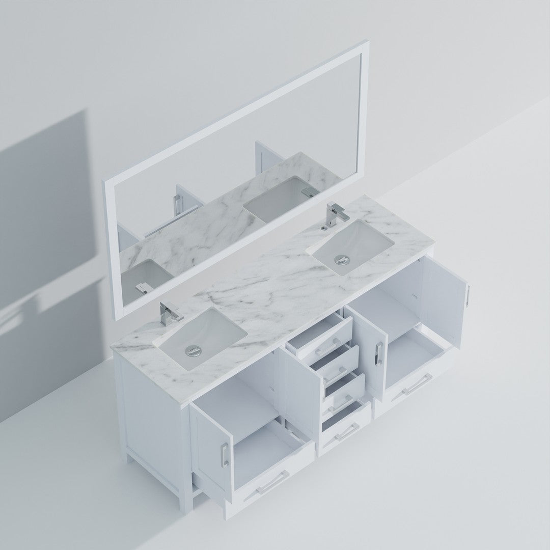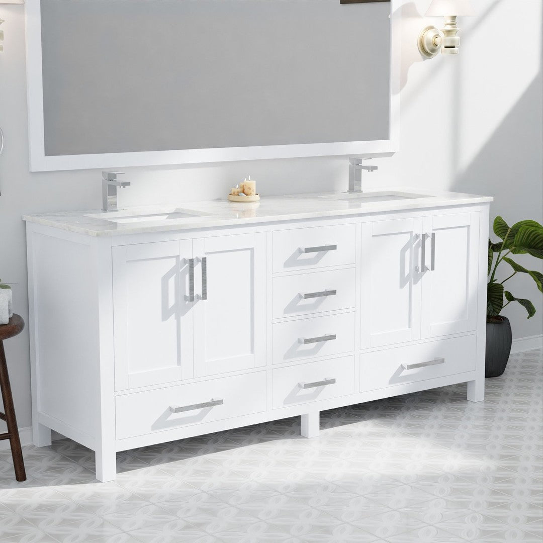 Bring refined elegance and practical storage to your bathroom with this white double vanity set, complete with a durable Carrara marble top, coordinated faucet, and large mirror. Designed for both style and everyday functionality, the ensemble combines a classic look with modern performance—ideal for master bathrooms or shared powder rooms.