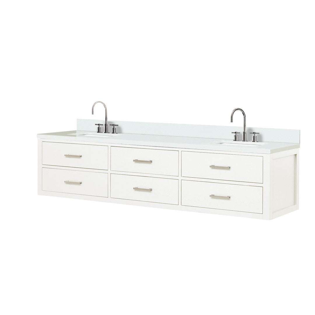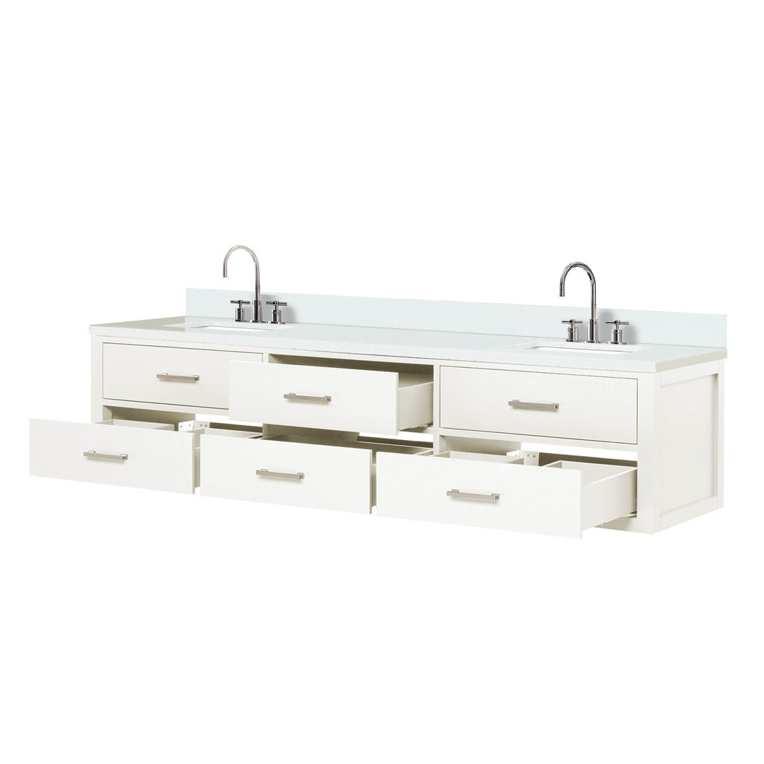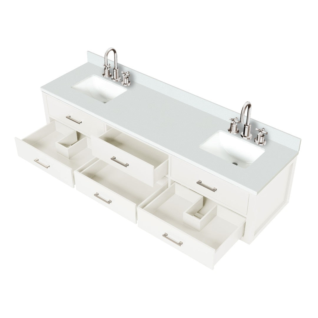 Elevate your bathroom with this elegant white double vanity that combines classic styling with modern functionality. Designed for spacious bathrooms, it pairs a durable cultured marble top and chrome gooseneck faucets with a solid wood frame and soft-close cabinetry for a refined, low-maintenance centerpiece.