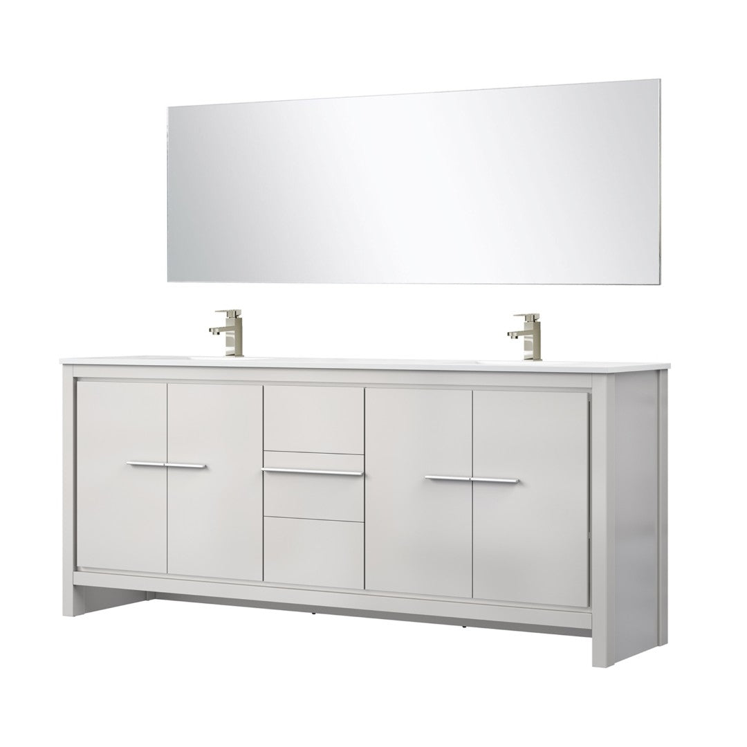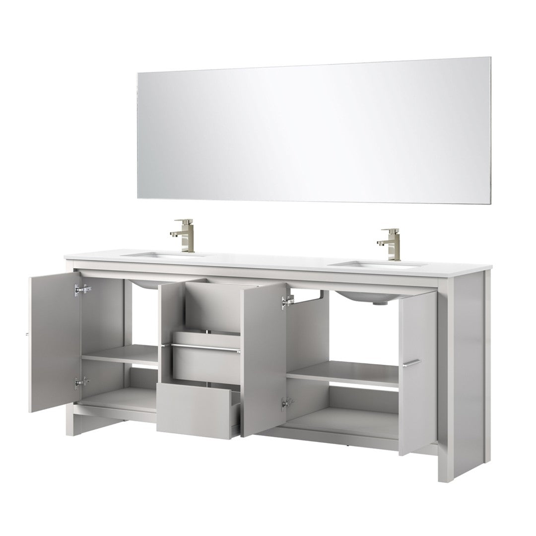 - Included components: Double sink vanity cabinet, white quartz countertop, Labaro brass single-hole bathroom faucet in brushed nickel, and 70 in. W x 24 in. H mirror