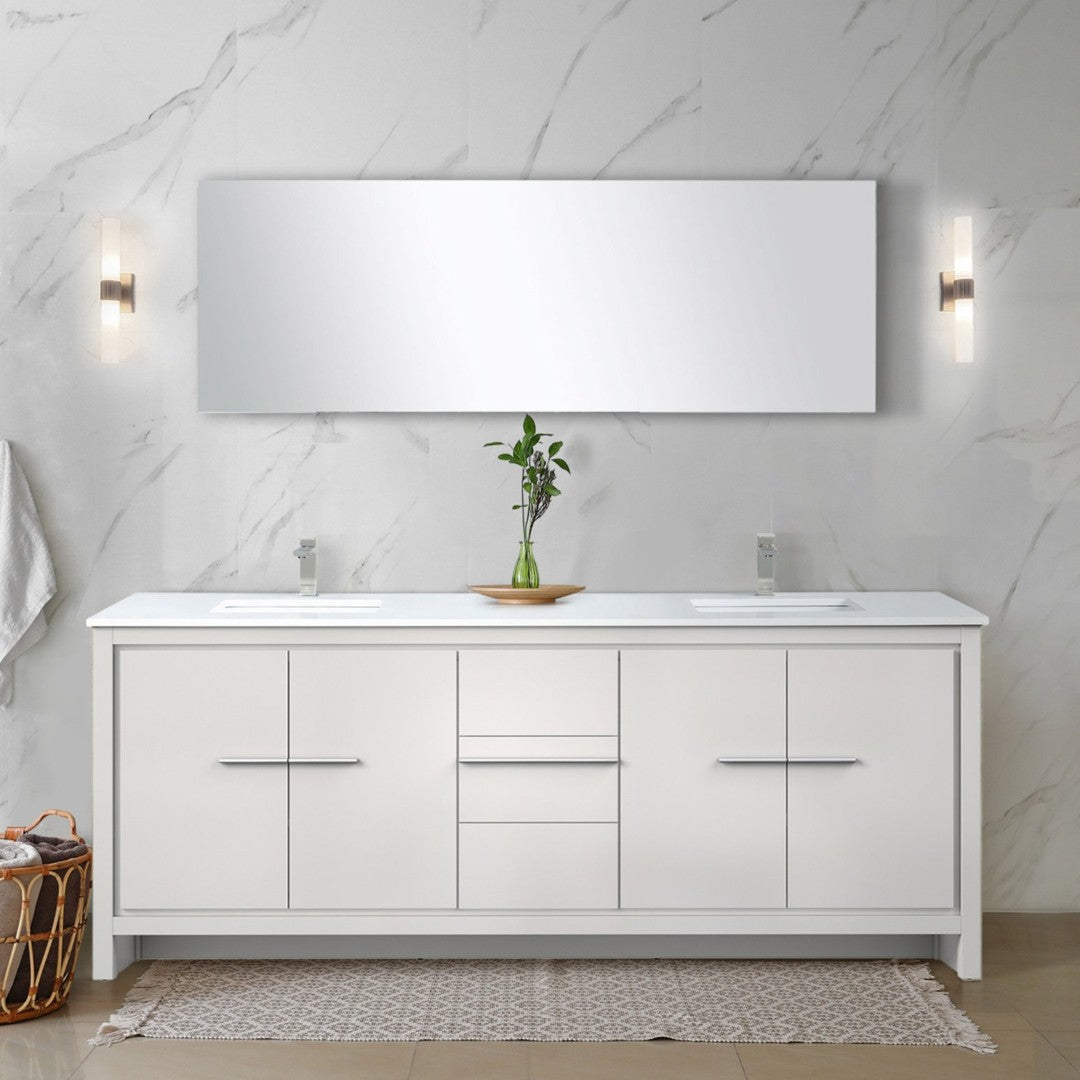 Transform your bathroom with this elegant white double vanity ensemble—designed for modern functionality and lasting durability. The set combines a spacious 80-inch wide vanity with a scratch- and stain-resistant white quartz top, a coordinated brushed nickel faucet set, and a large 70-inch mirror to create a cohesive, high-end look that elevates both style and everyday convenience.